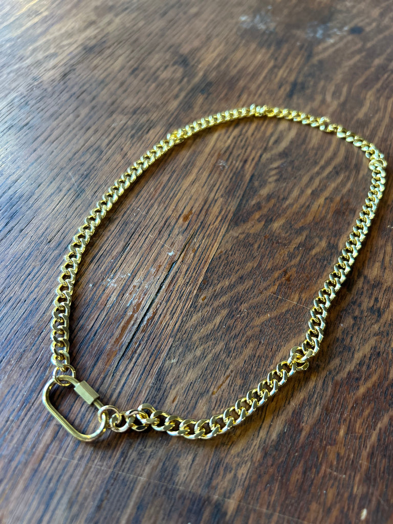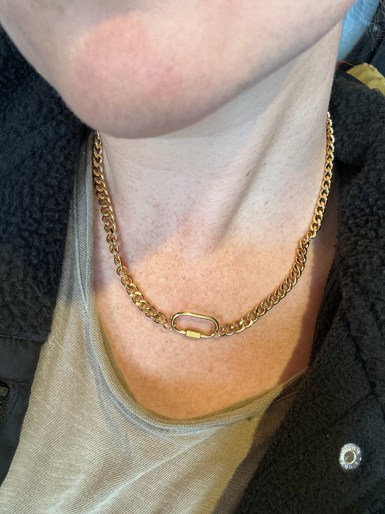 The Carabiner Screw Lock Necklace is a timeless jewelry staple as a clasp and a pendant. Mixed Chain in a chunky style- Cuban. The Carabiner Collection allows you to stack your charms and chains. It is chic, Rock, Messy, Bohemian. Amulet link or Charm Collection Holder Created in a stainless steel model making it difficult to make but stunning and long lasting. Opens with a twisting bead to add charms or other chains. You can adjust these as clasps to make necklaces or bracelets or mix and match your stack 14K Genuine gold plated then EP coated.