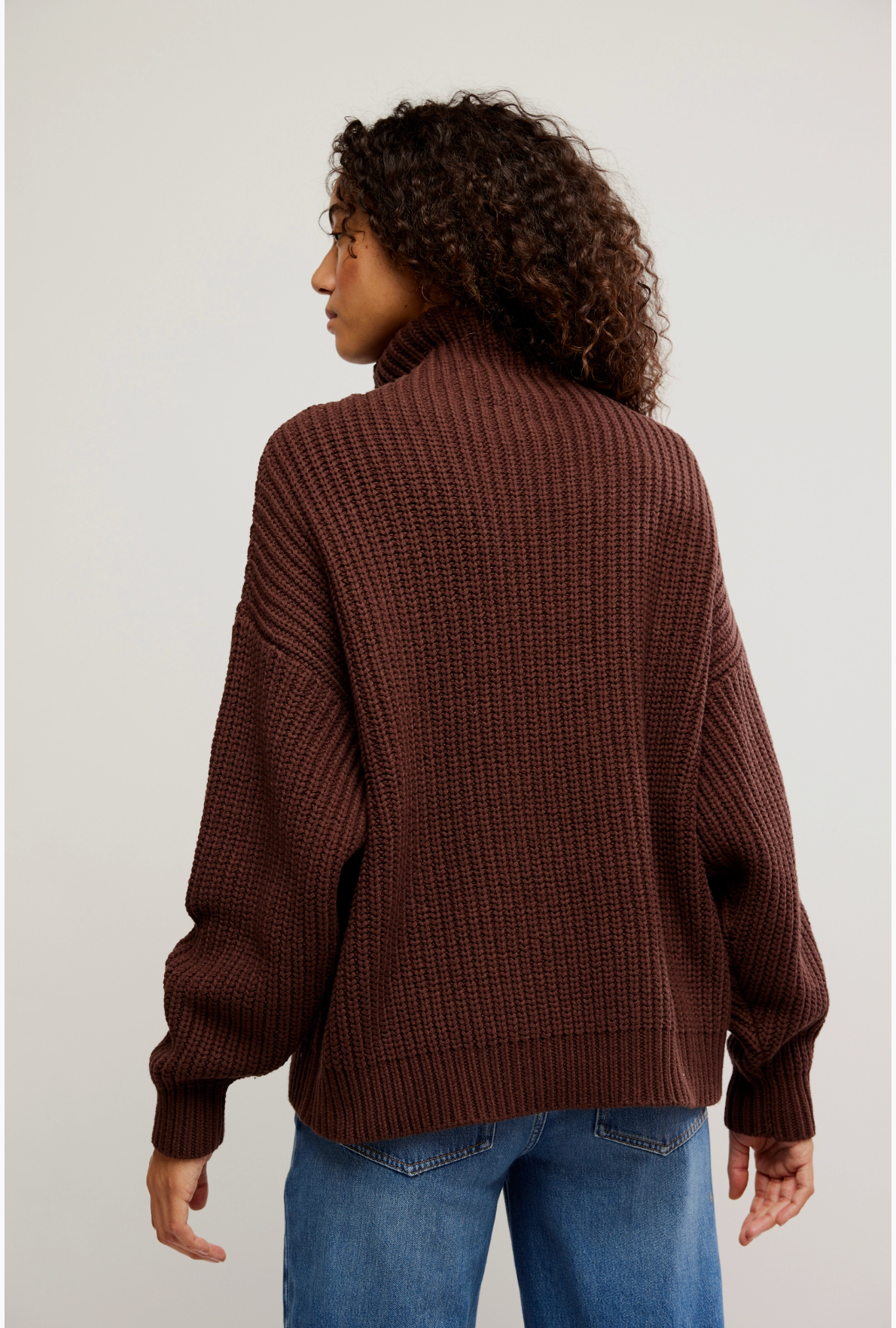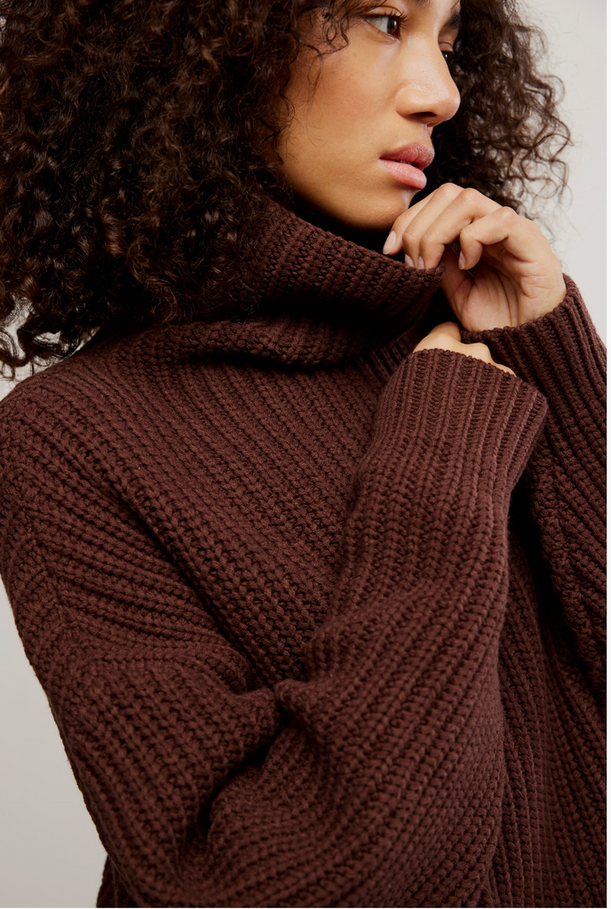 Turtleneck design, oversized fit, unlined construction, cozy knit texture, easy layering piece