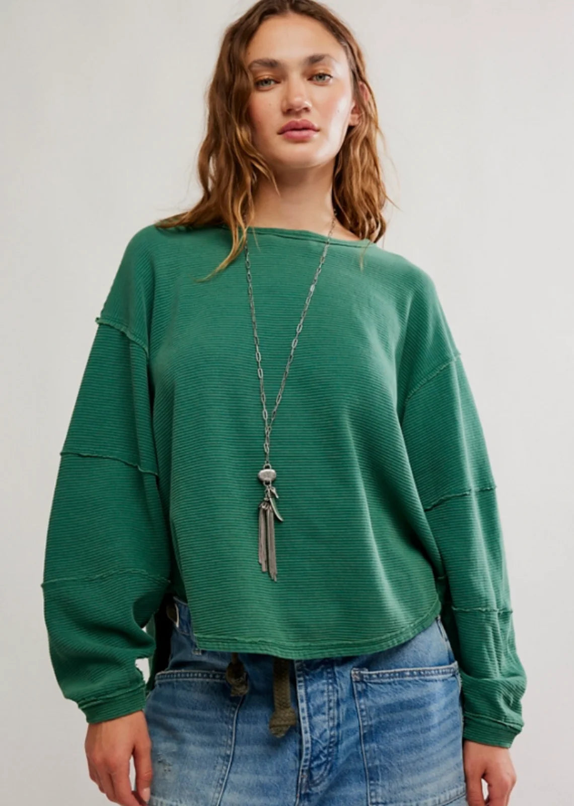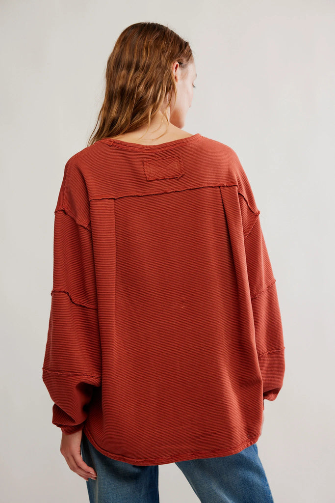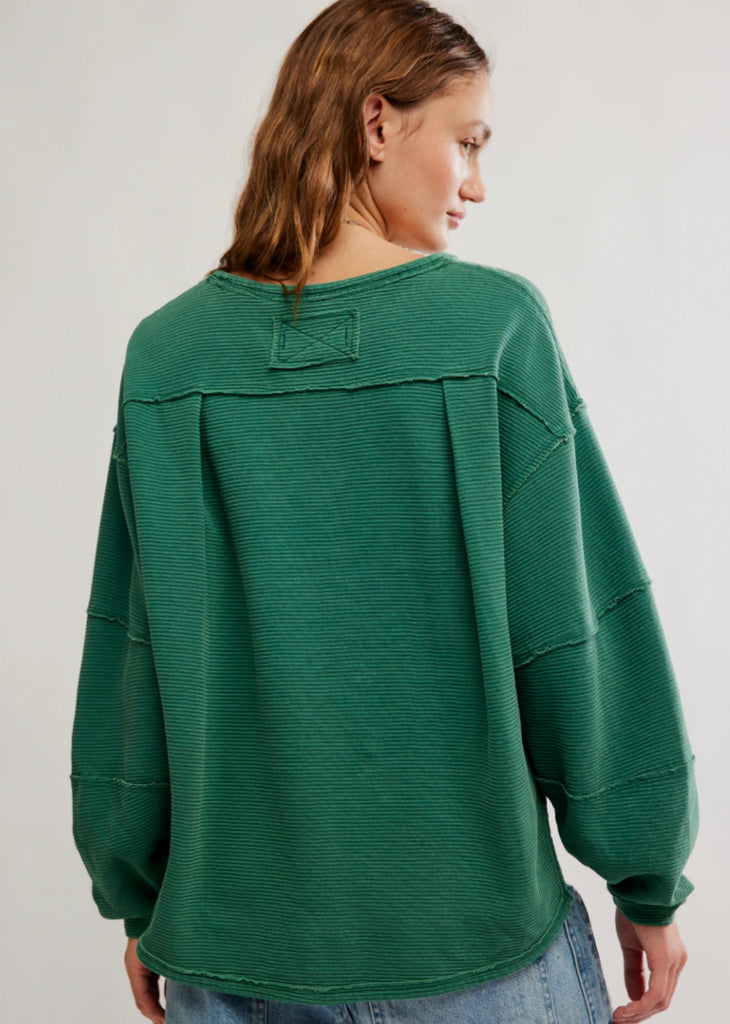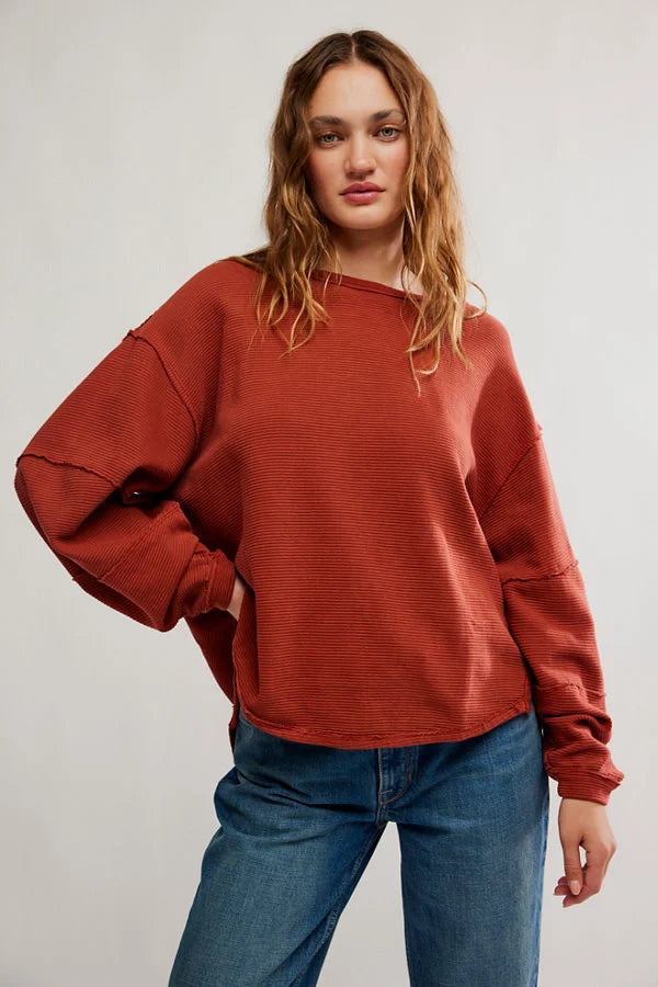 BACK BY POPULAR DEMAND! An elevated take on the classic tee, this long-sleeve from Free People features a ribbed fabrication and slouchy silhouette with defined seams and a scoop-neckline.