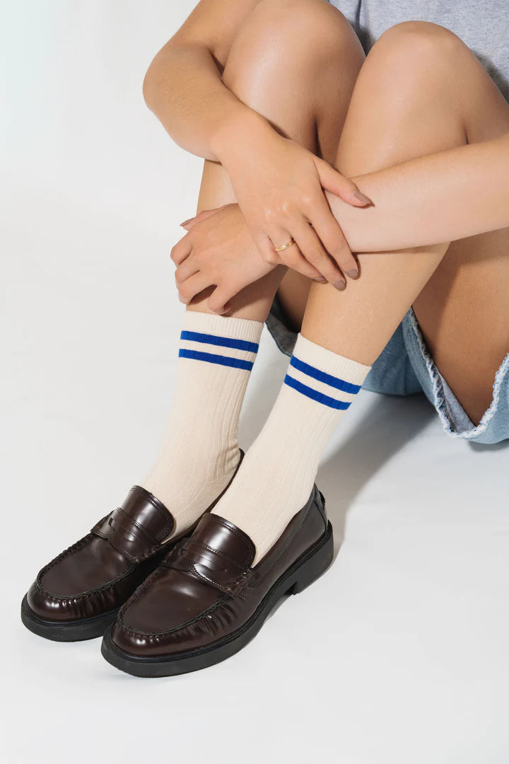 The Academy Sock is a refined take on the classic sport crew reimagined with a feminine twist. It features a signature wide rib, contrasting double stripes at the cuff and the perfect weight to carry you through every season.