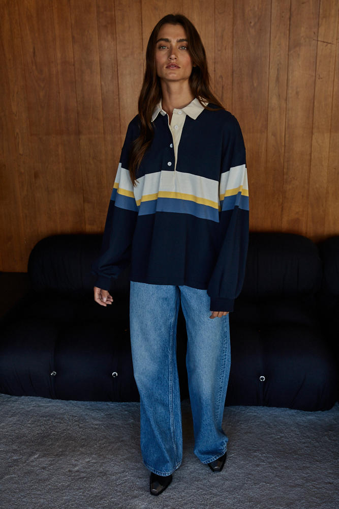 We couldn't wait for the Brookline Rugby Polo! This playful long-sleeve pullover features a striped printed knit cotton jersey with a classic collar and a 4-button placket, finished with side slits for added flair.