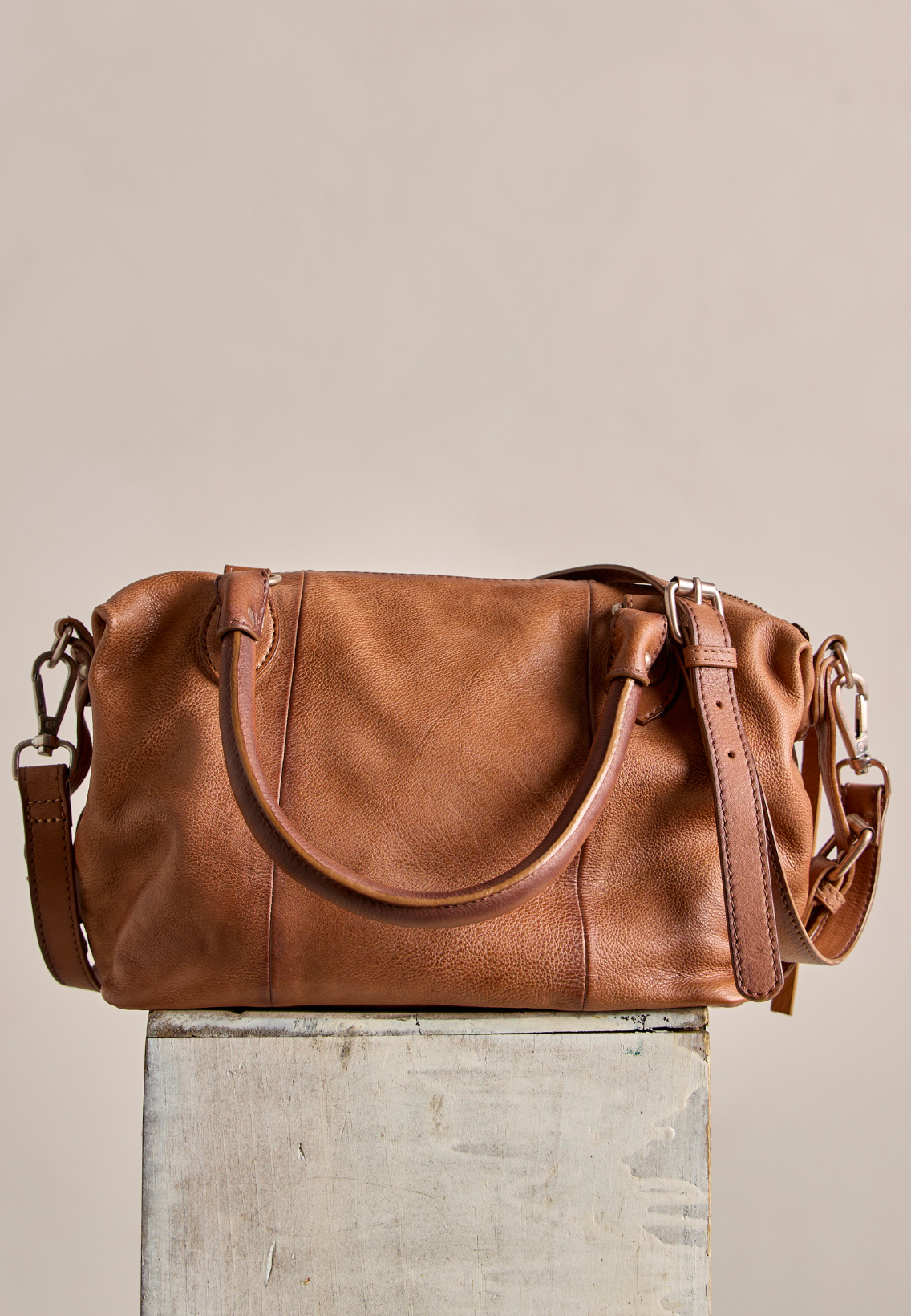 Vintage-inspired leather fabrication, two carrying straps, adjustable and detachable shoulder strap, main zip entry, exterior zip pockets, interior zip pocket, leather pull tabs, logo embossed tag.