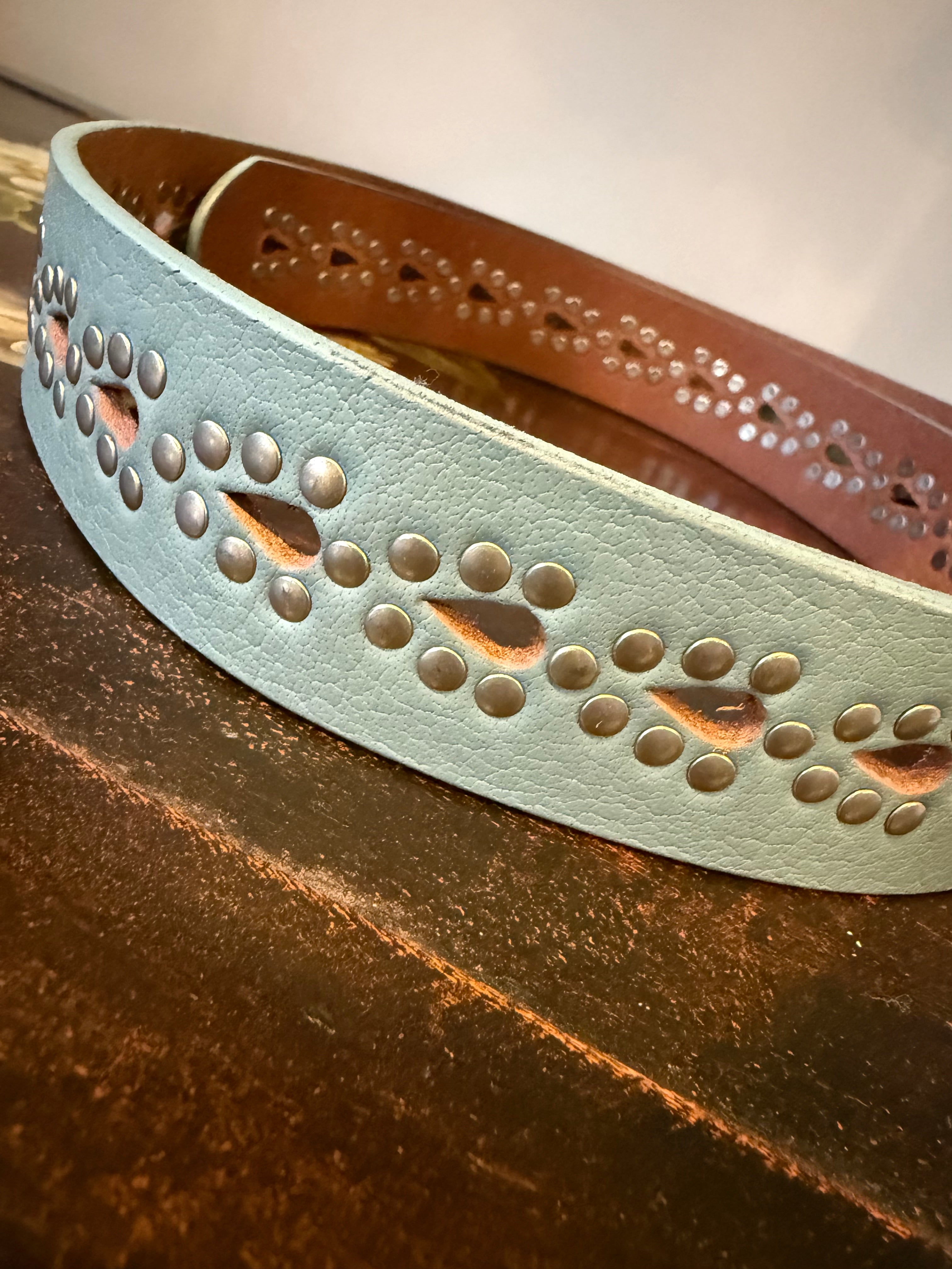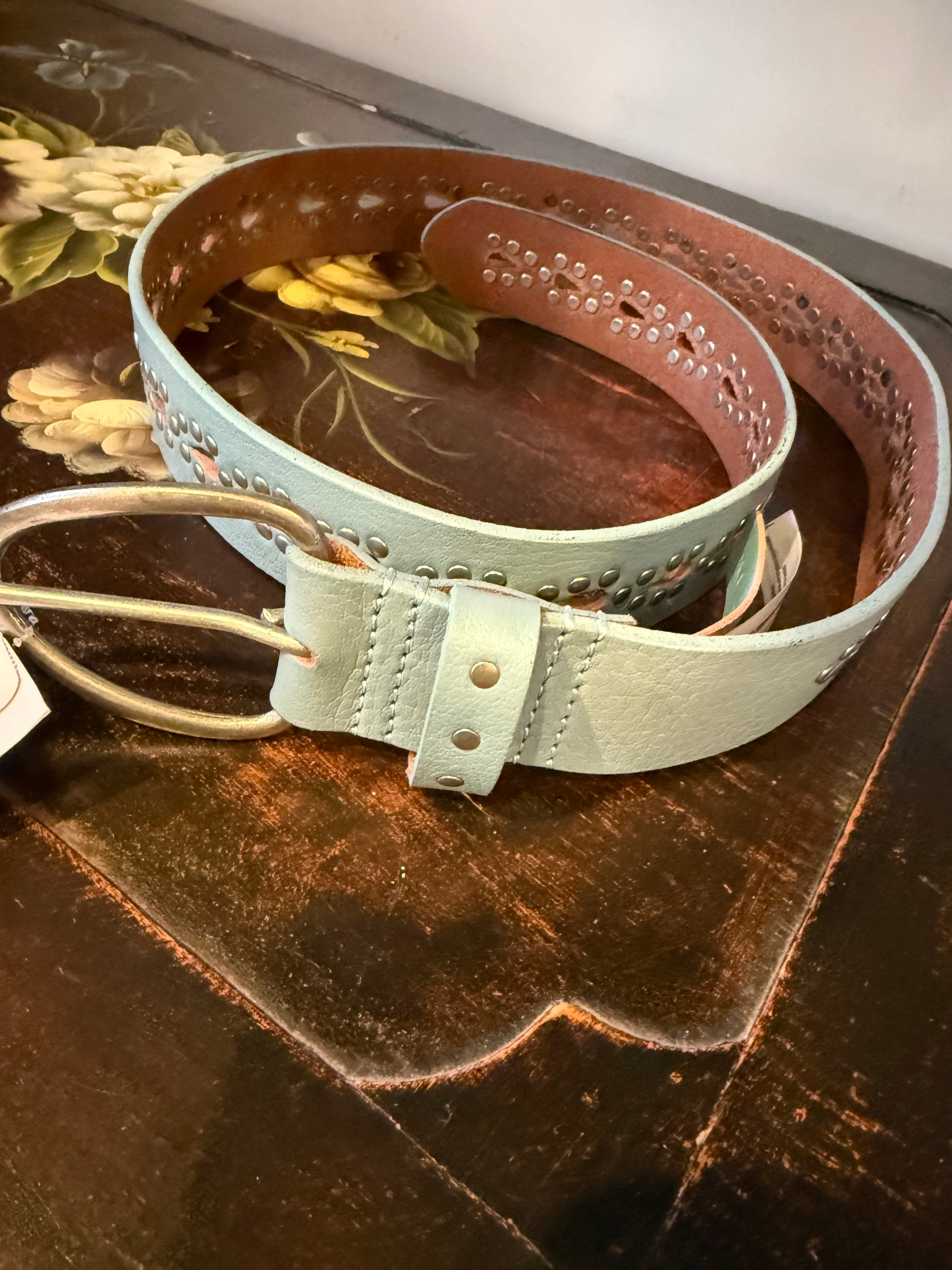 This so cool belt features teardrop cutouts and studded accents throughout for added edge to any ‘fit.