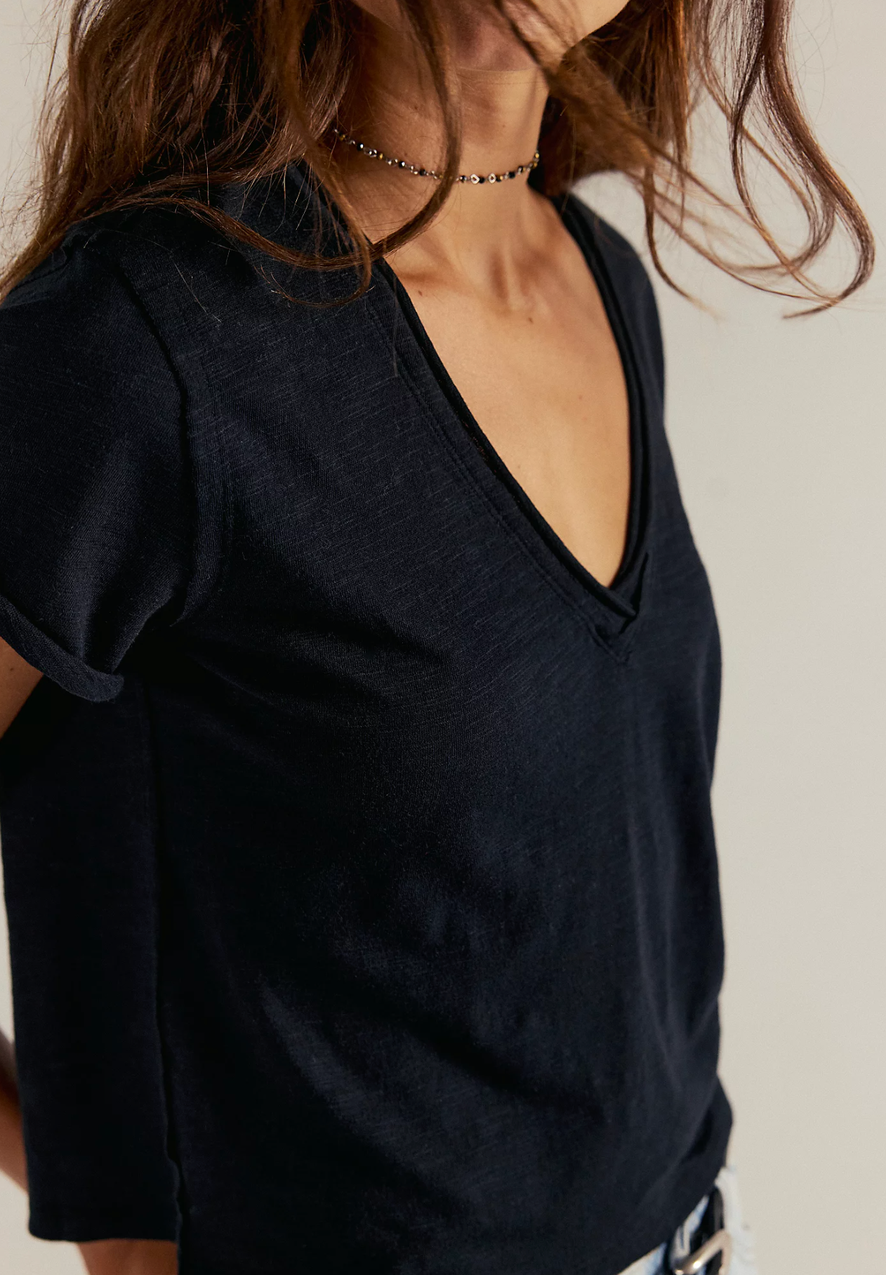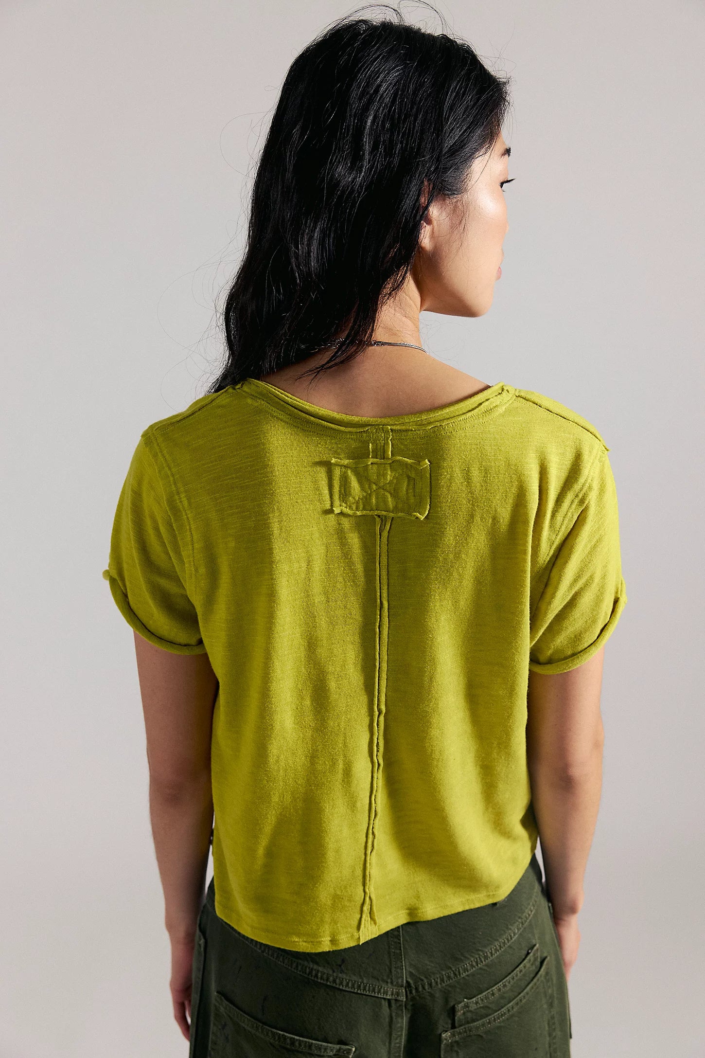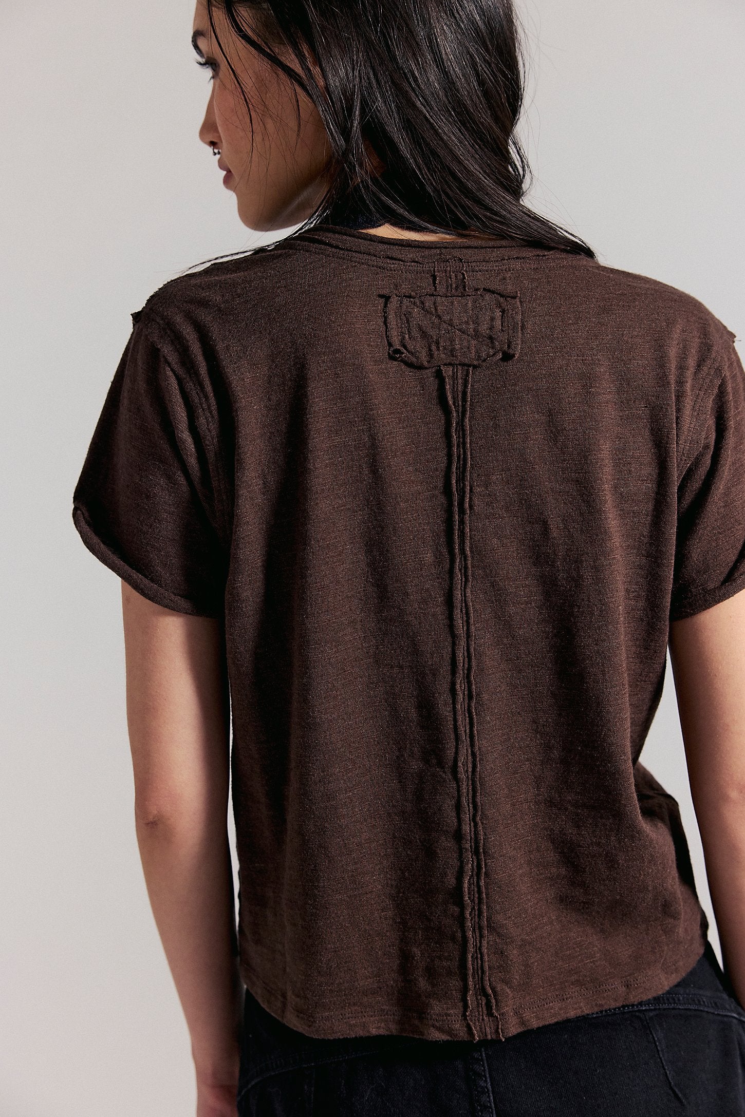 Perfect for layering, this short-sleeved tee is featured in a boxy cut and a V-neckline for endless outfitting potential.