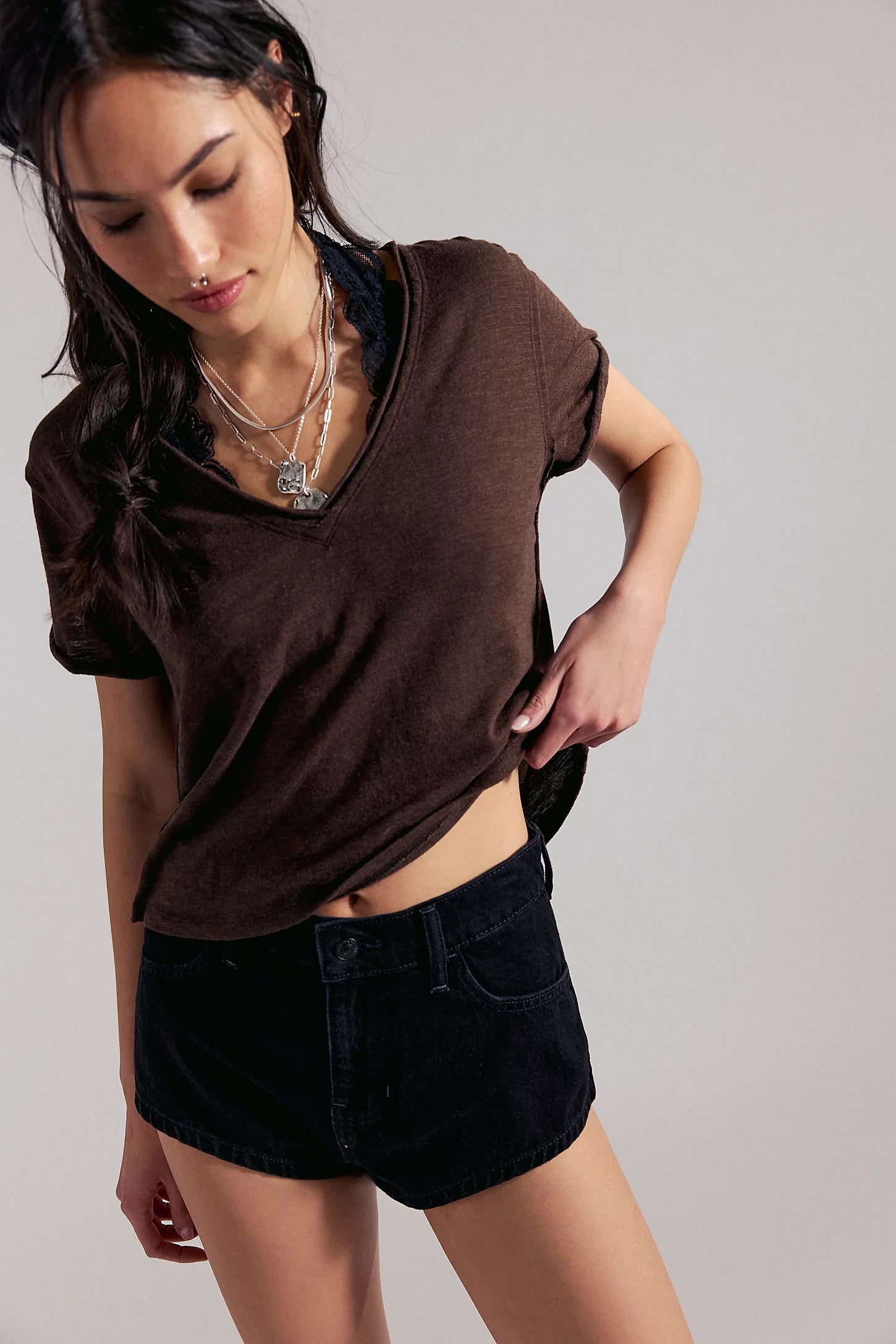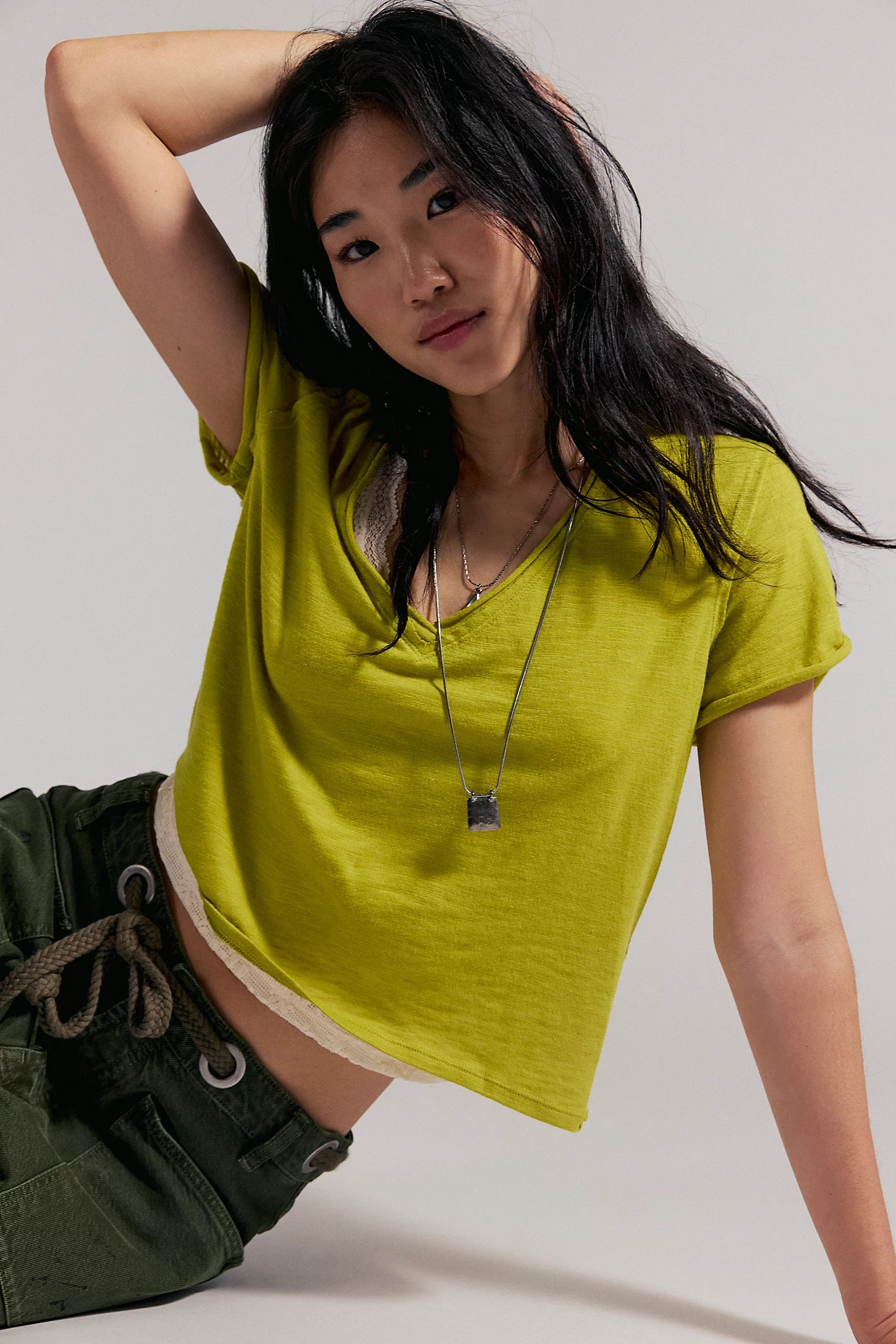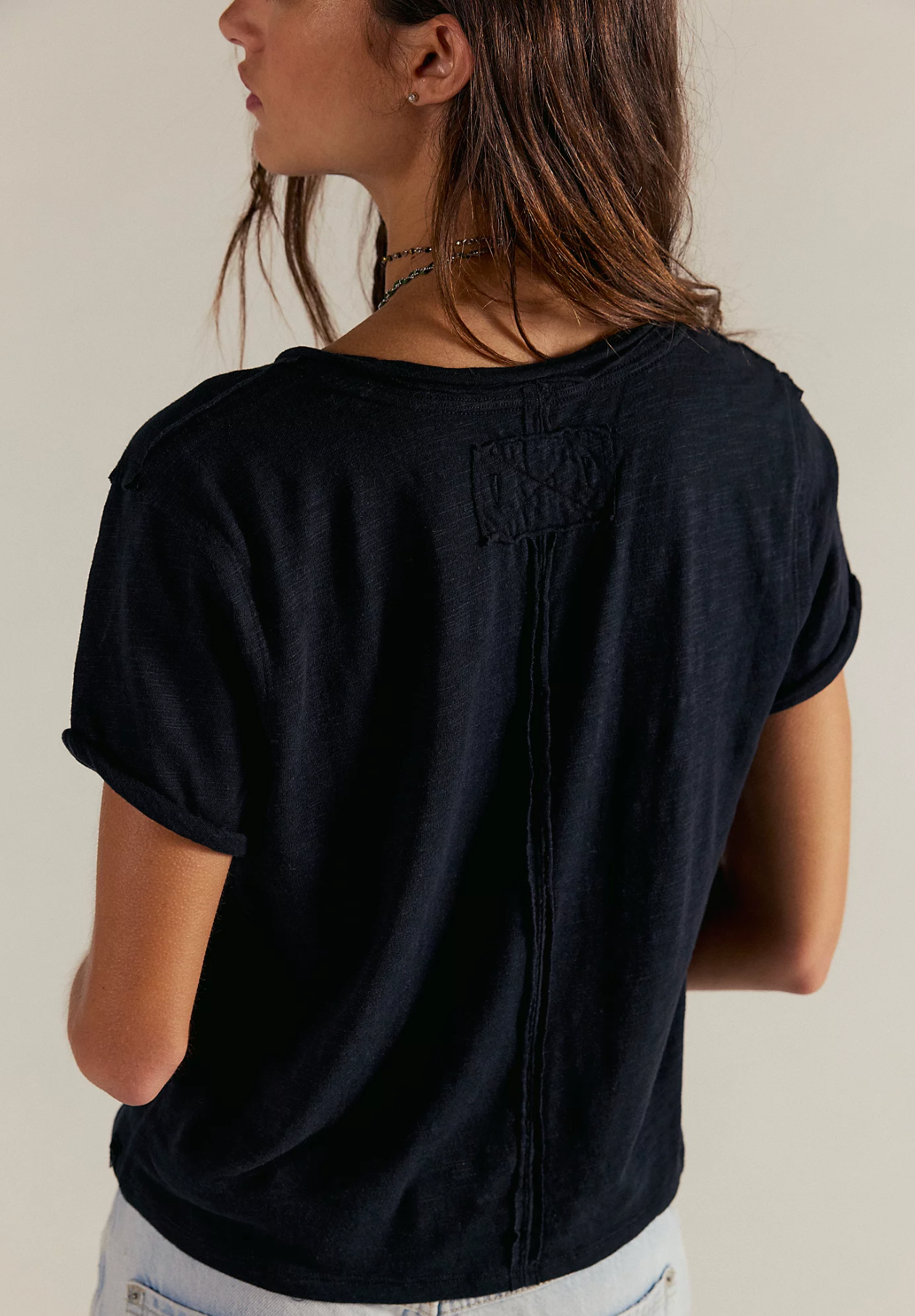 Perfect for layering, this short-sleeved tee is featured in a boxy cut and a V-neckline for endless outfitting potential.