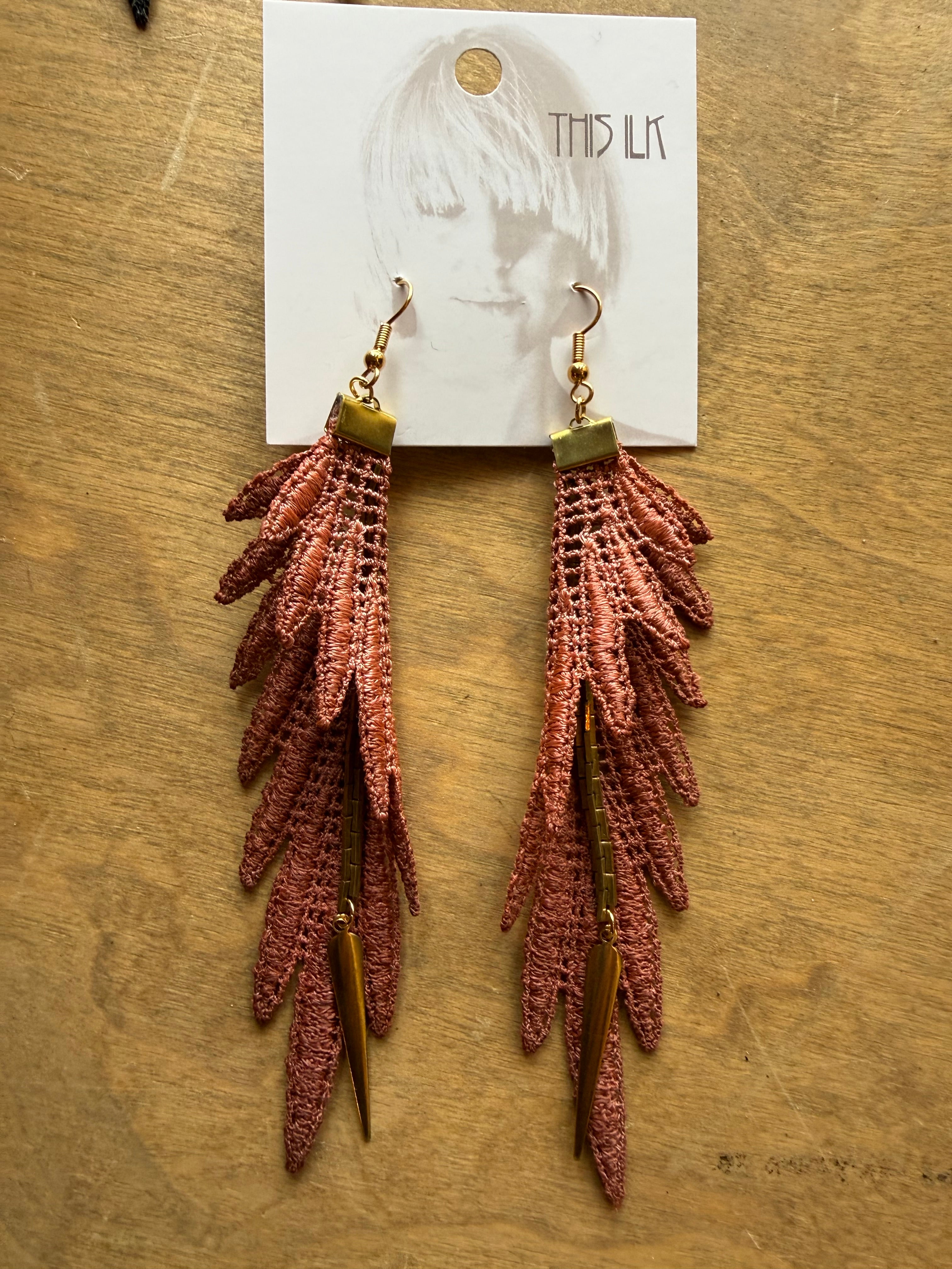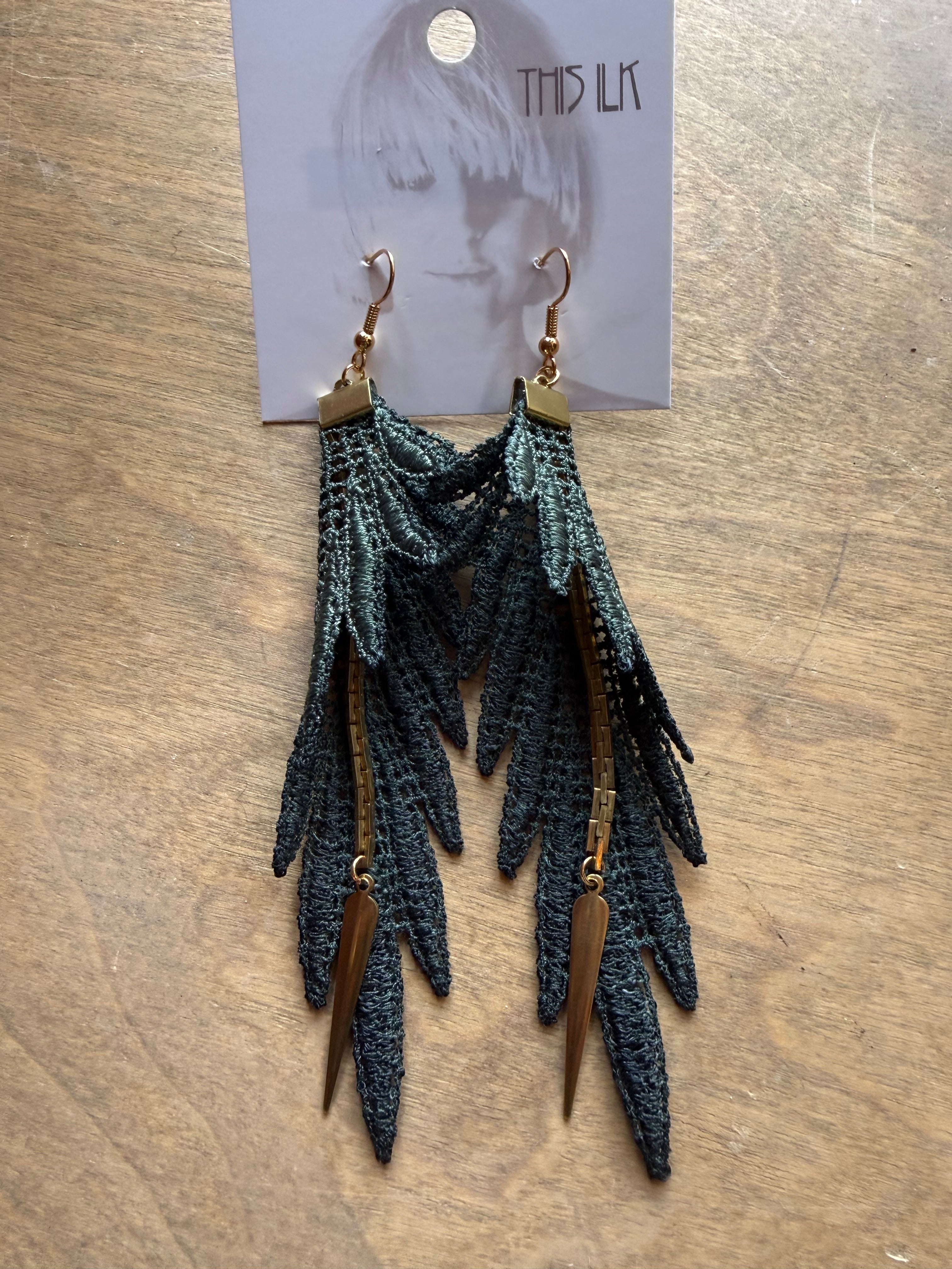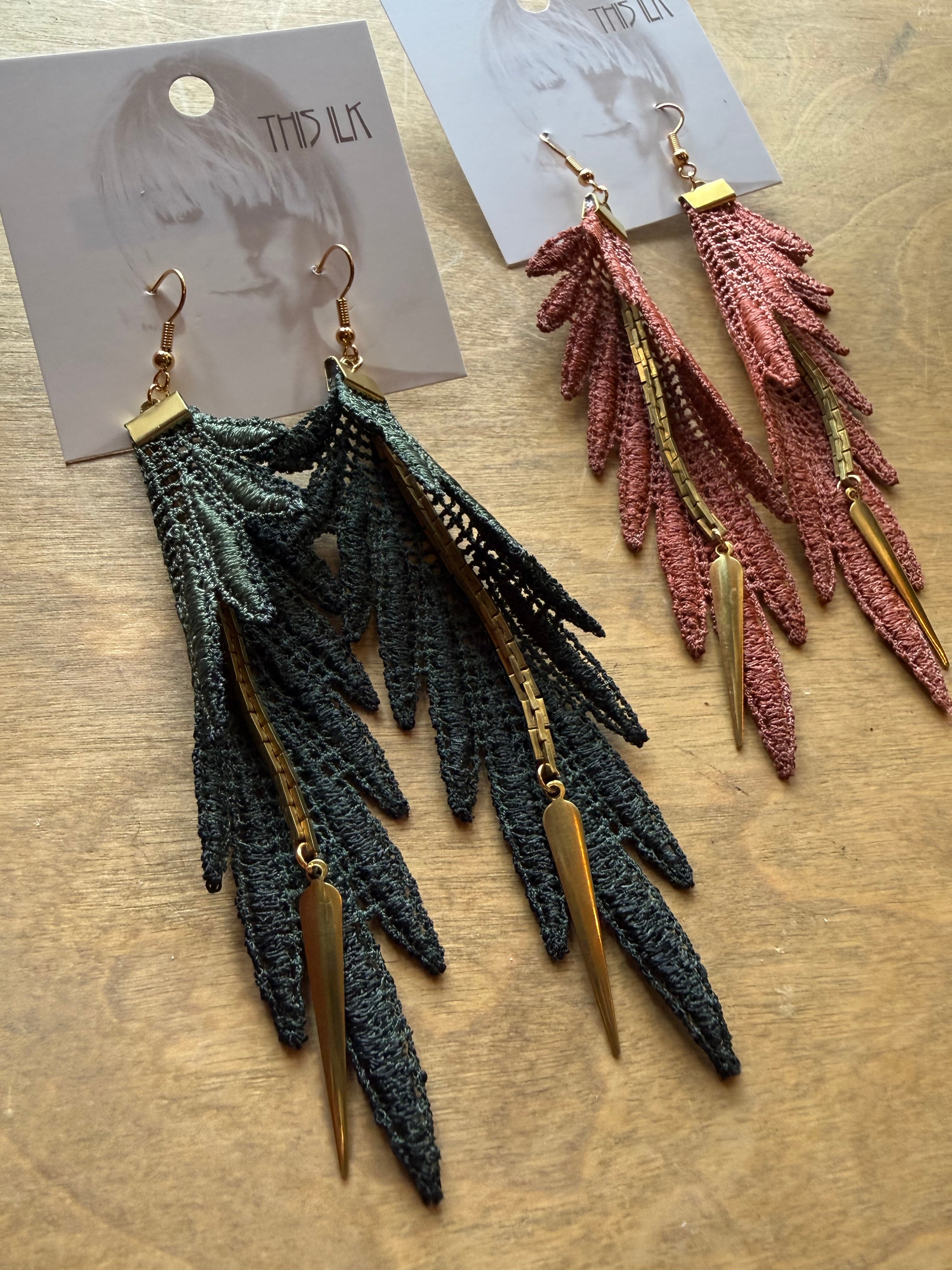 Just like the long colorful feathers of the parrot's wings, these statement earrings are as light as can be. Composed of hand-dyed lace with vintage brass chain and other brass parts. A more durable alternative to feather earrings with a similar bohemian or bold aesthetic.