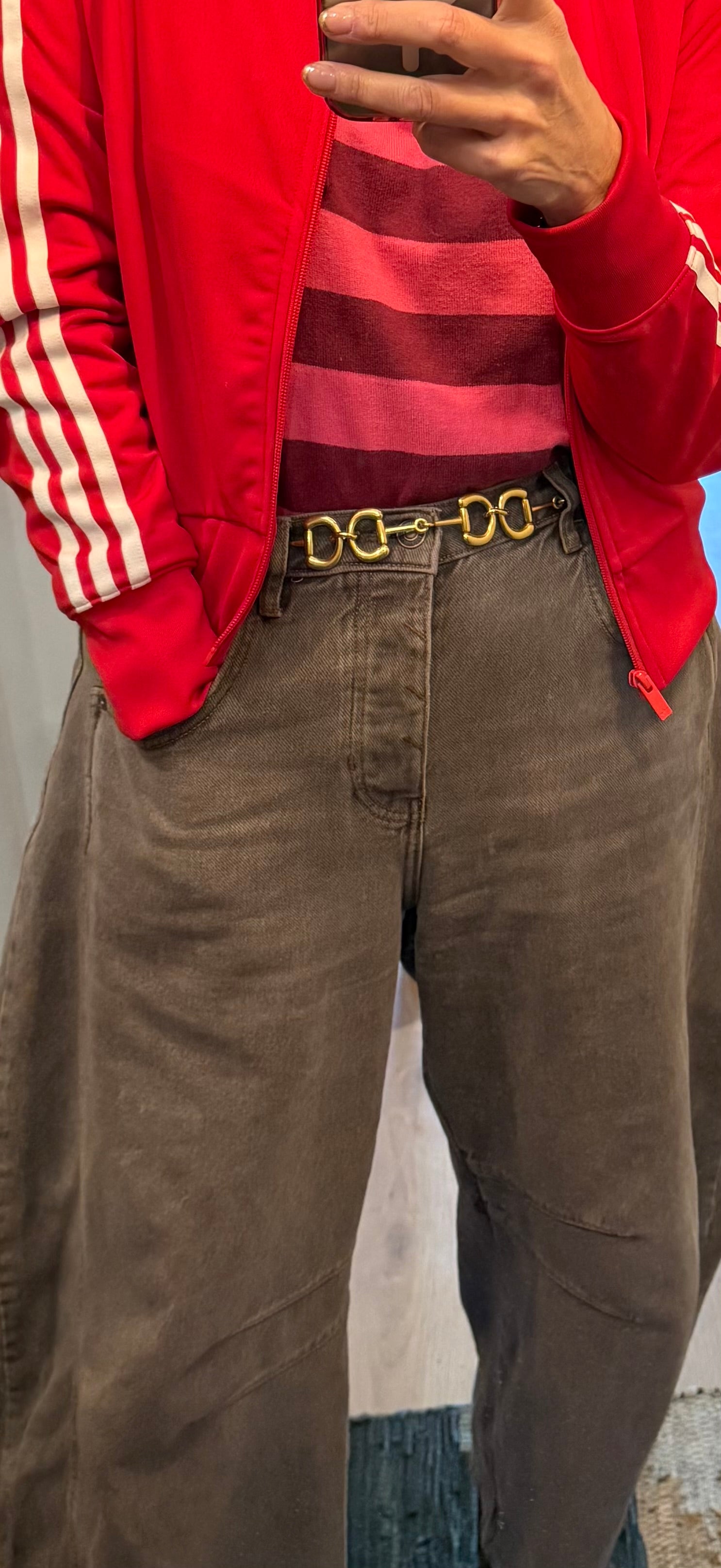 Equestrian Snaffle Bit Chain Belt! This is made of the same long lasting heavy brass as the designer ones. It is 8 stations of large articulated Snaffle bits on a heavy chain and large lobster claw clasp. This is Antique gold to give it old money collected feeling.