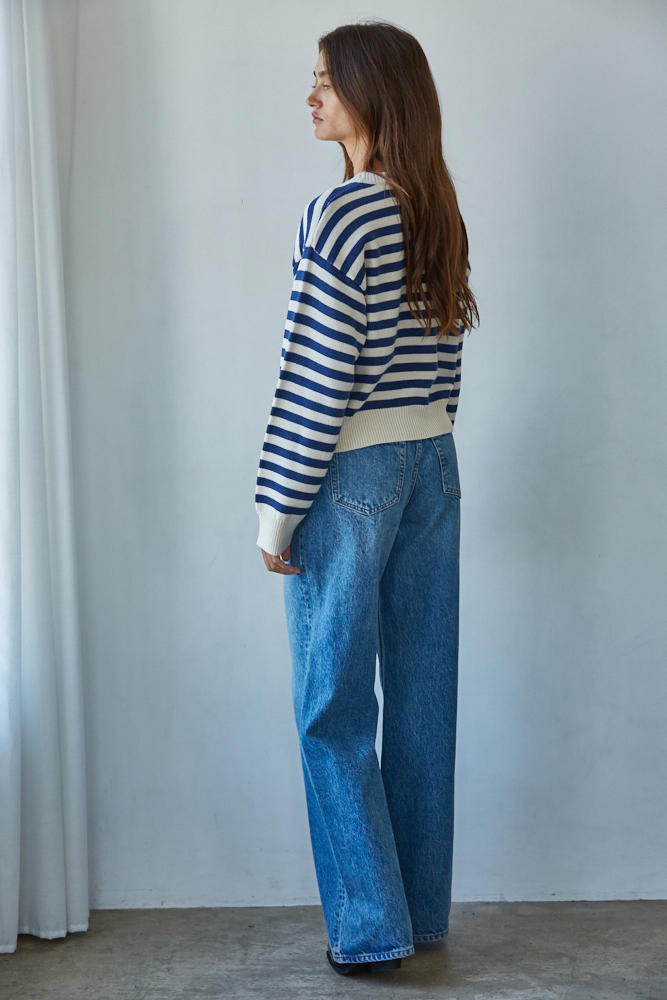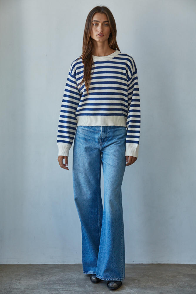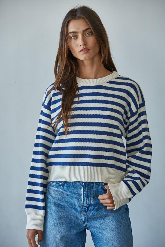 Elevate your fall wardrobe with this striped knit pullover featuring a flattering round neck and long sleeves. Designed for both comfort and style, it's the perfect sweater to keep you cozy all season long. Coming in Cream Navy, and Cream Red.