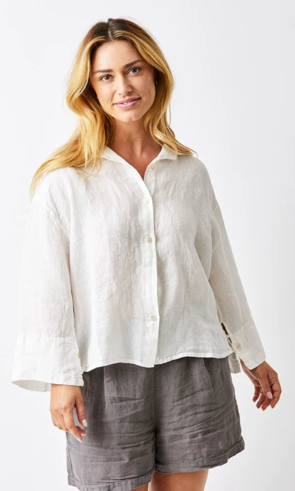 Effortless elegance meets everyday comfort in this boxy button-down shirt. Crafted from crisp white linen, it's designed with a relaxed, oversized fit that flatters every frame. The timeless silhouette pairs seamlessly with everything from tailored trousers to your favorite jeans, making it a versatile wardrobe essential. Perfect for warm weather styling, this piece breathes beautifully while maintaining its structured shape. Layer it, tie it, or wear it solo—this shirt adapts to your mood and season.