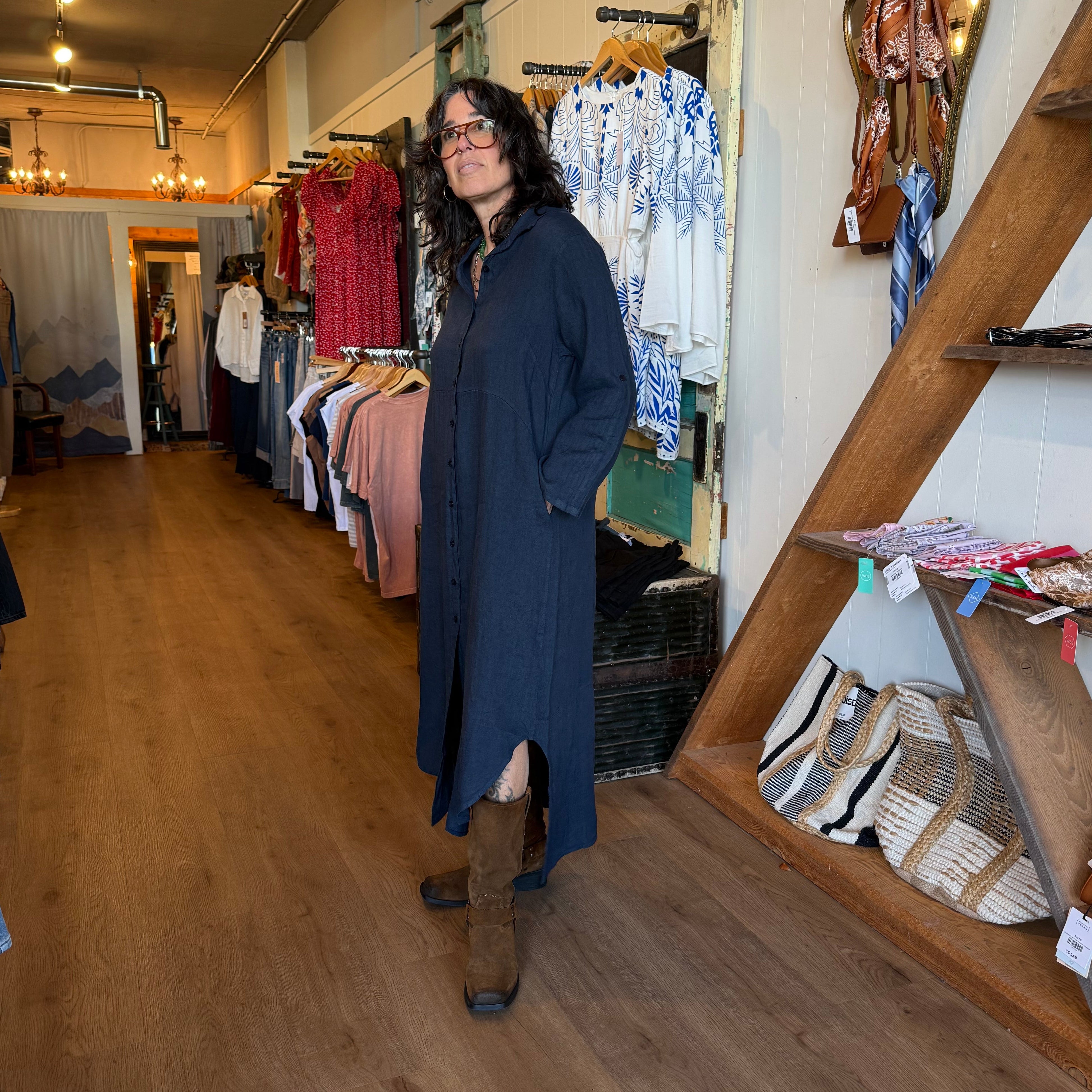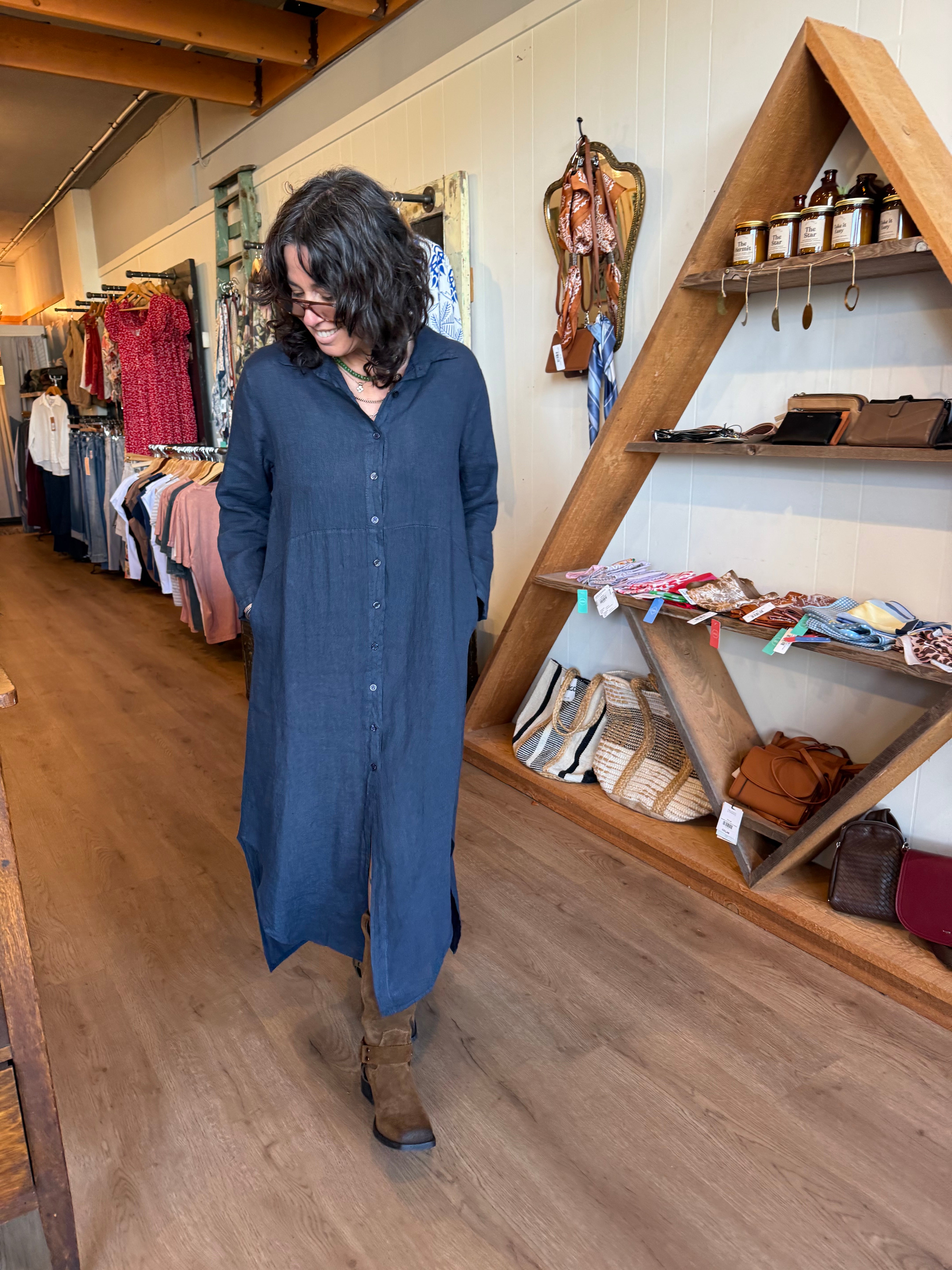 Effortless elegance meets everyday comfort in this navy linen shirt dress. Crafted from breathable linen, it's perfect for warm weather styling—dress it up with accessories for a polished look or keep it casual with sneakers. The classic button-down design and relaxed fit make it a versatile wardrobe essential that transitions seamlessly from day to evening. A timeless piece that feels as good as it looks.