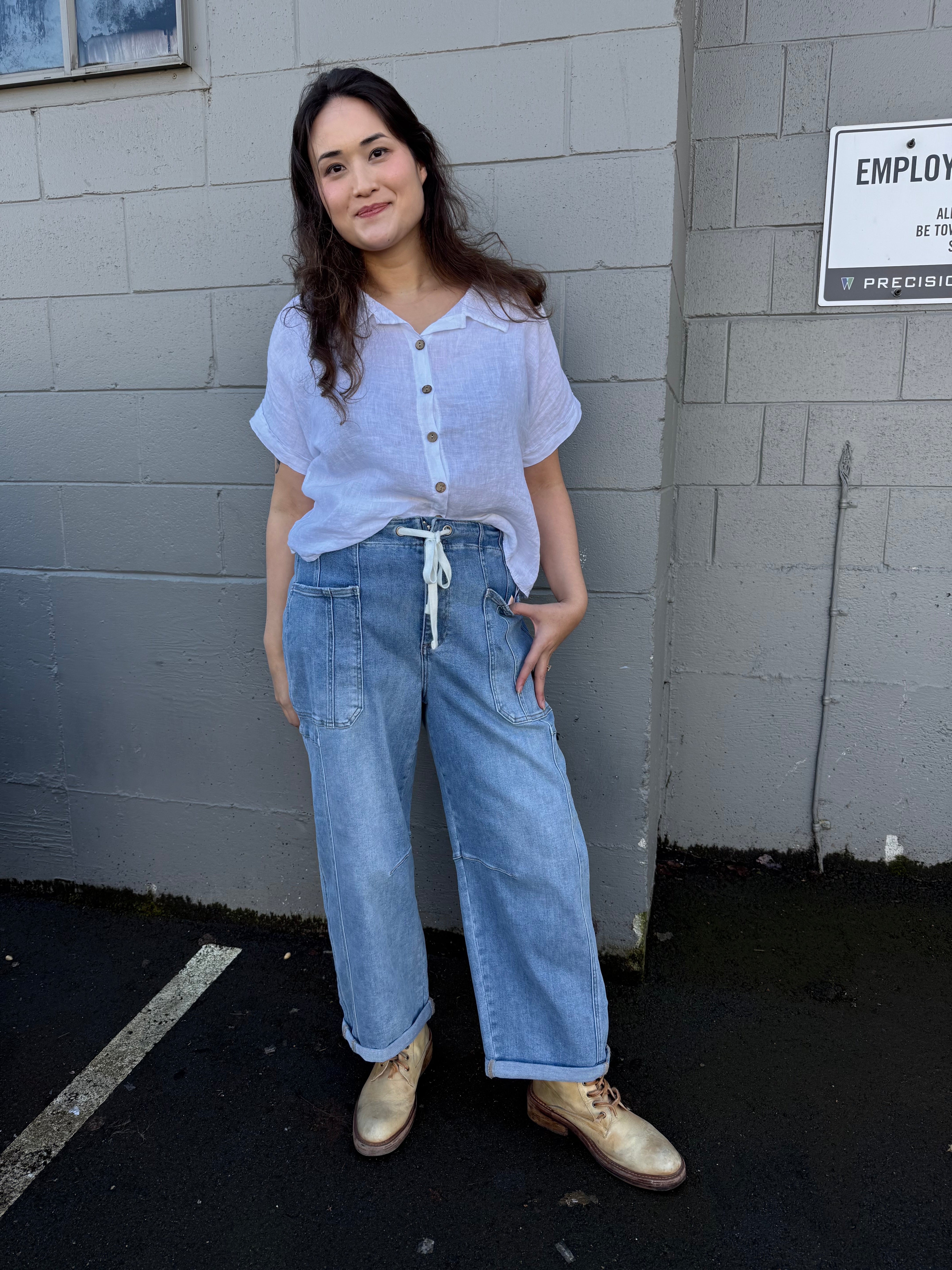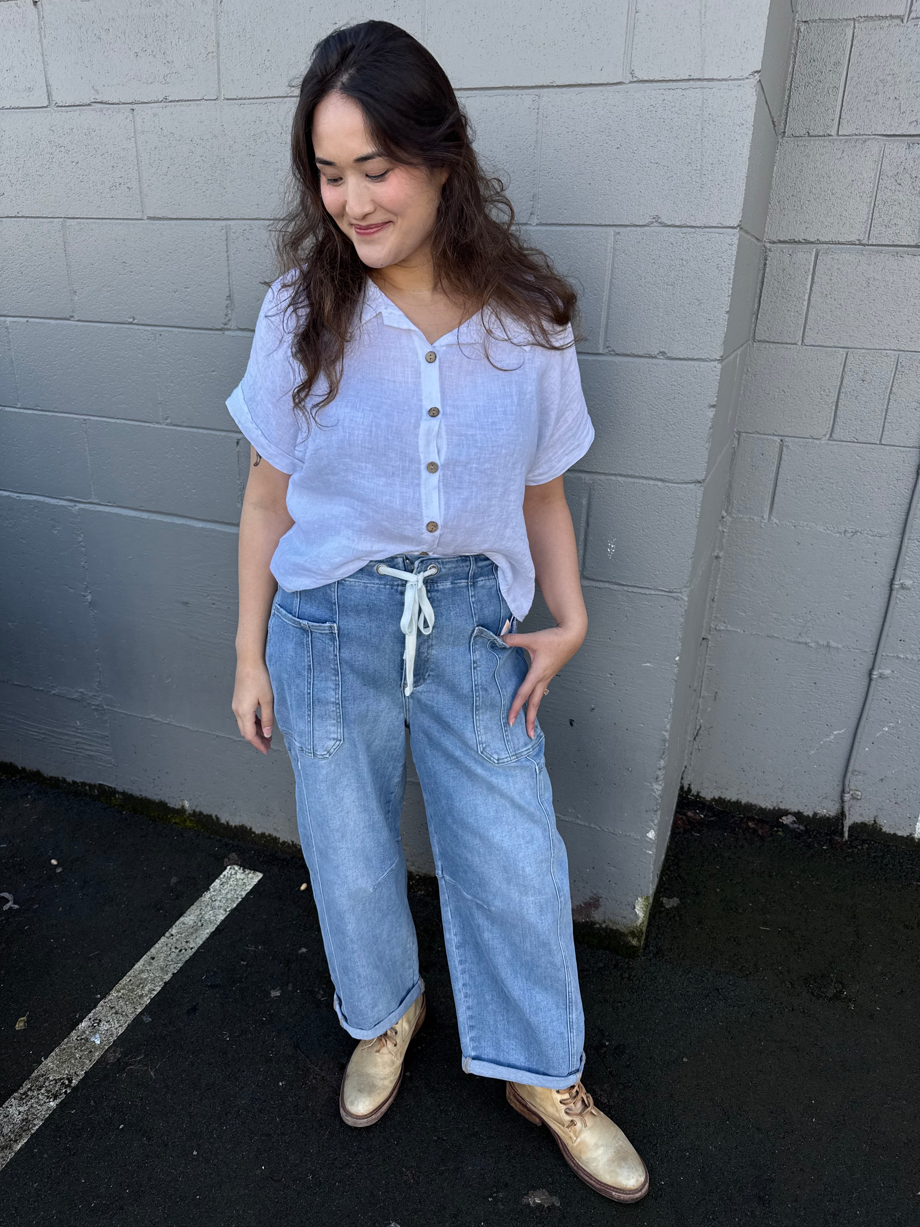 100% Linen collared, short sleeve classic by Suzy D London.