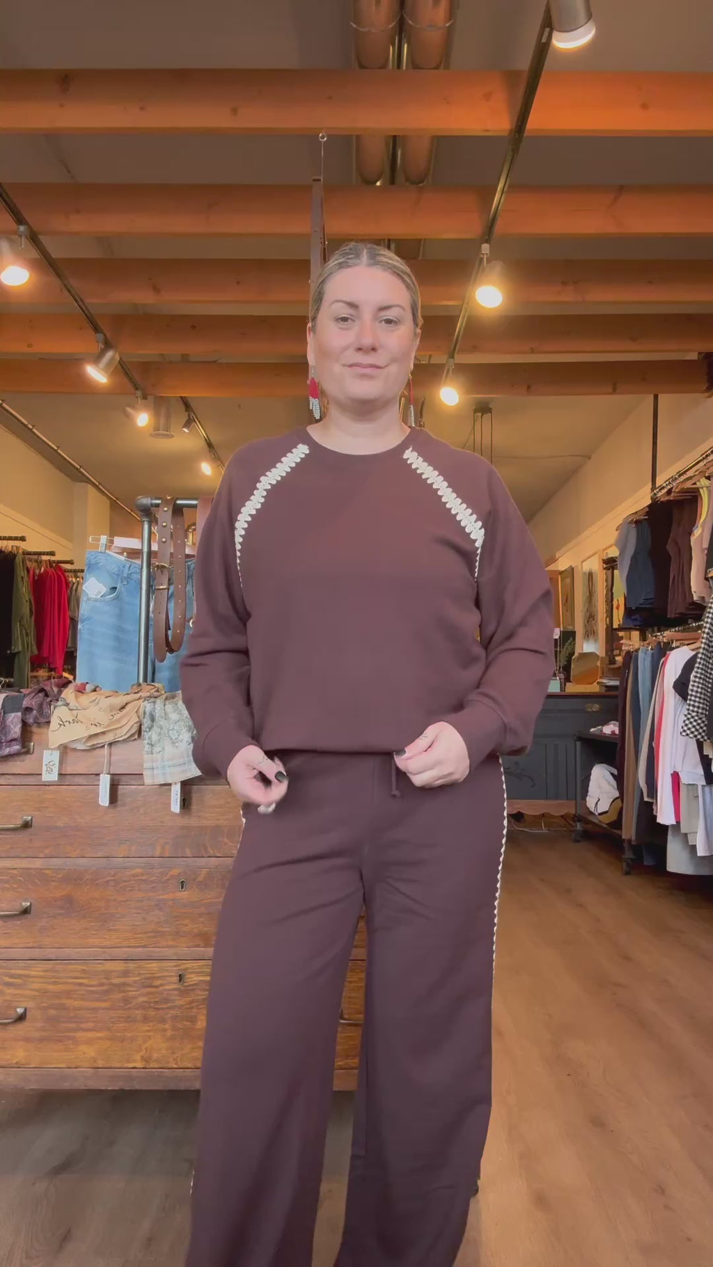 Chocolate cherry, yes please. These wide-leg, french terry track pants sport a relaxed feel, finished with crochet trim for a soft update. Easygoing with a twist. Super comfy with a drawstring waist and delicate crochet trim at the sides for a soft-meets-feminine moment. PAIR WITH THE MATCHING Z SUPPLY ALL AROUND SWEATSHIRT