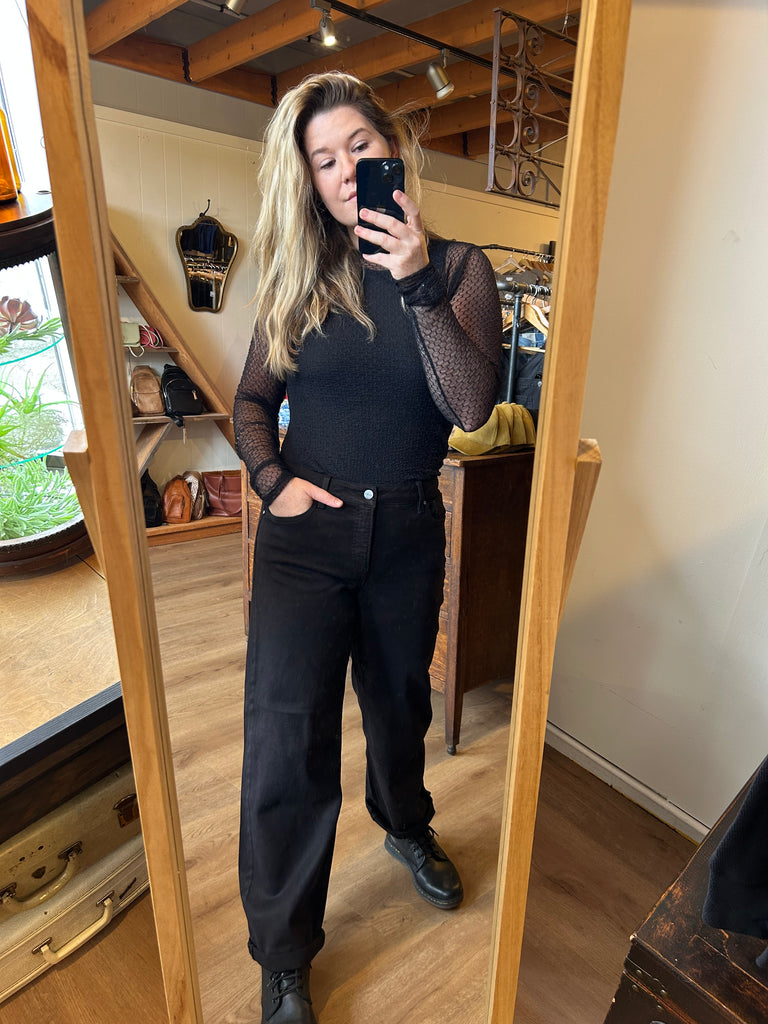 Risen Barrel Pants are a MILD Barrel...a great place to try out a slightly looser silhouette for those interested. These ones are a lighter weight fabric, with a MID RISE and TUMMY CONTROL!