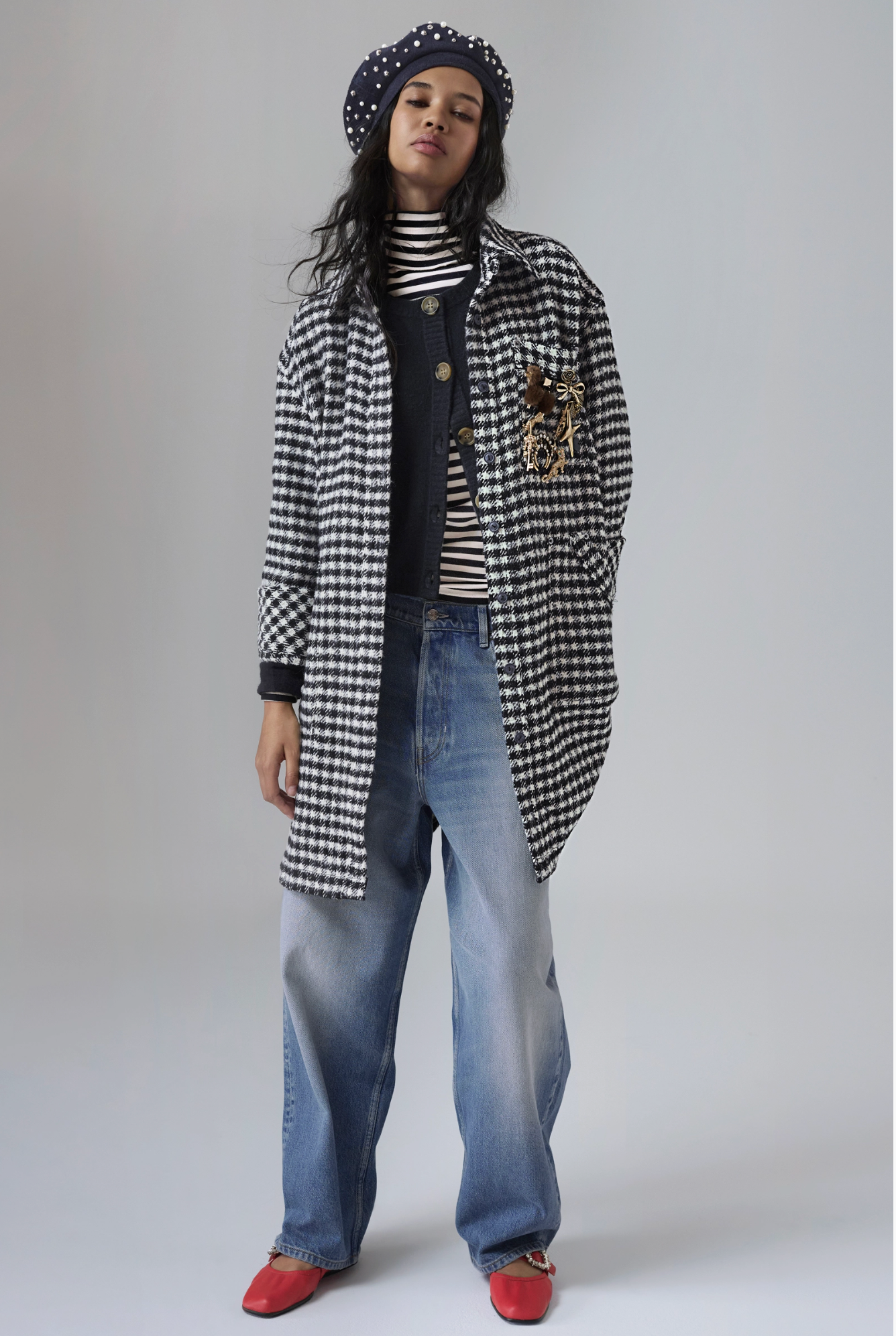 Features: Soft wool-blend, houndstooth fabrication, collared-neckline, button closures, drop-shoulder sleeves with cuffs, exaggerated patch-pocket detailing