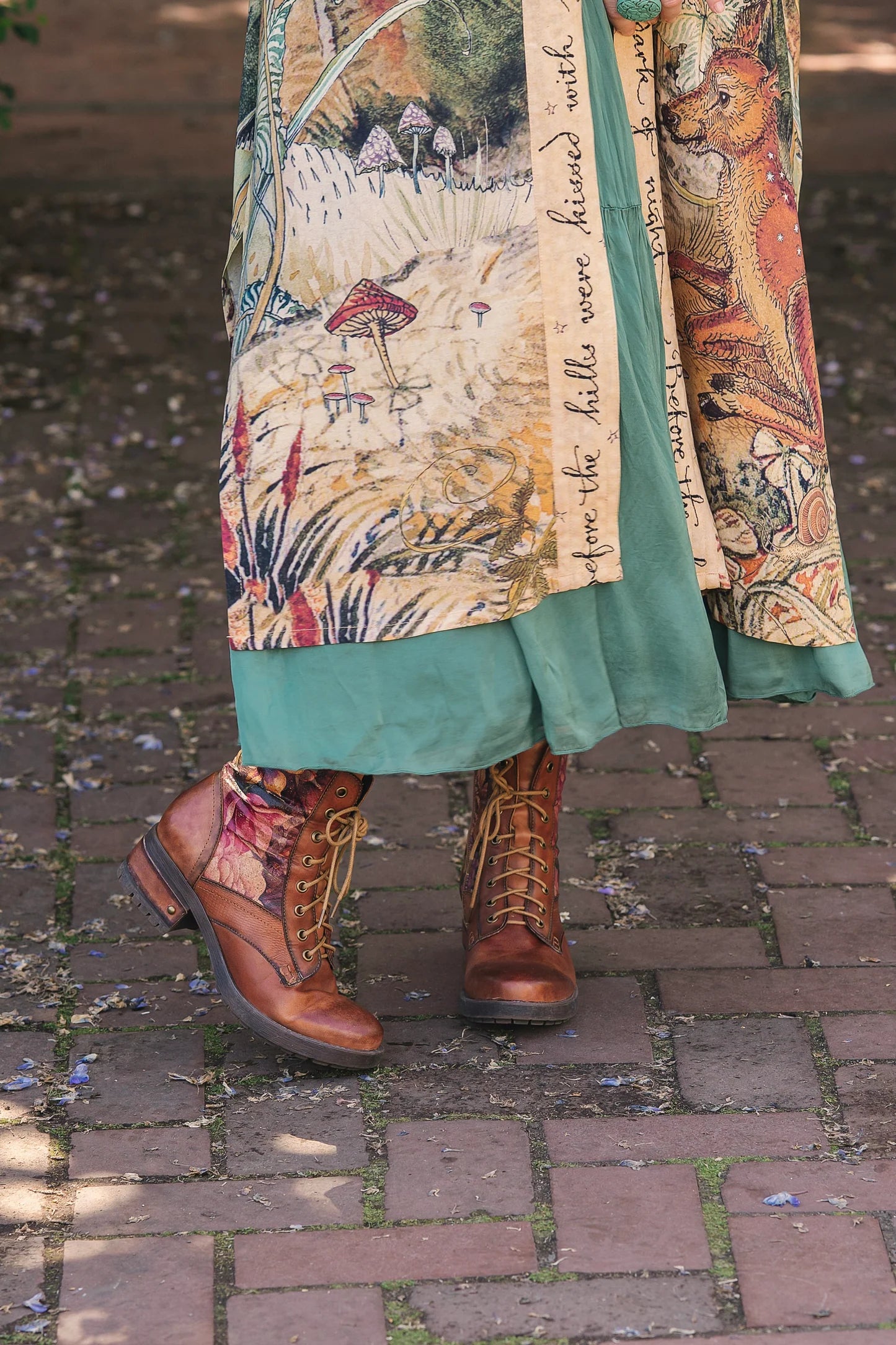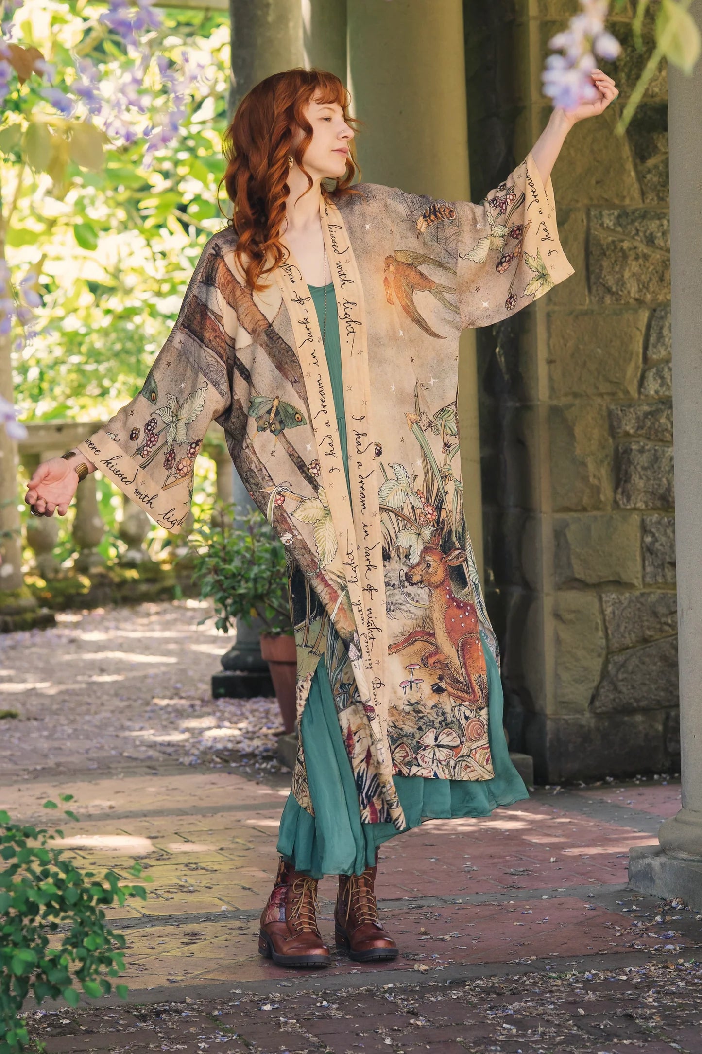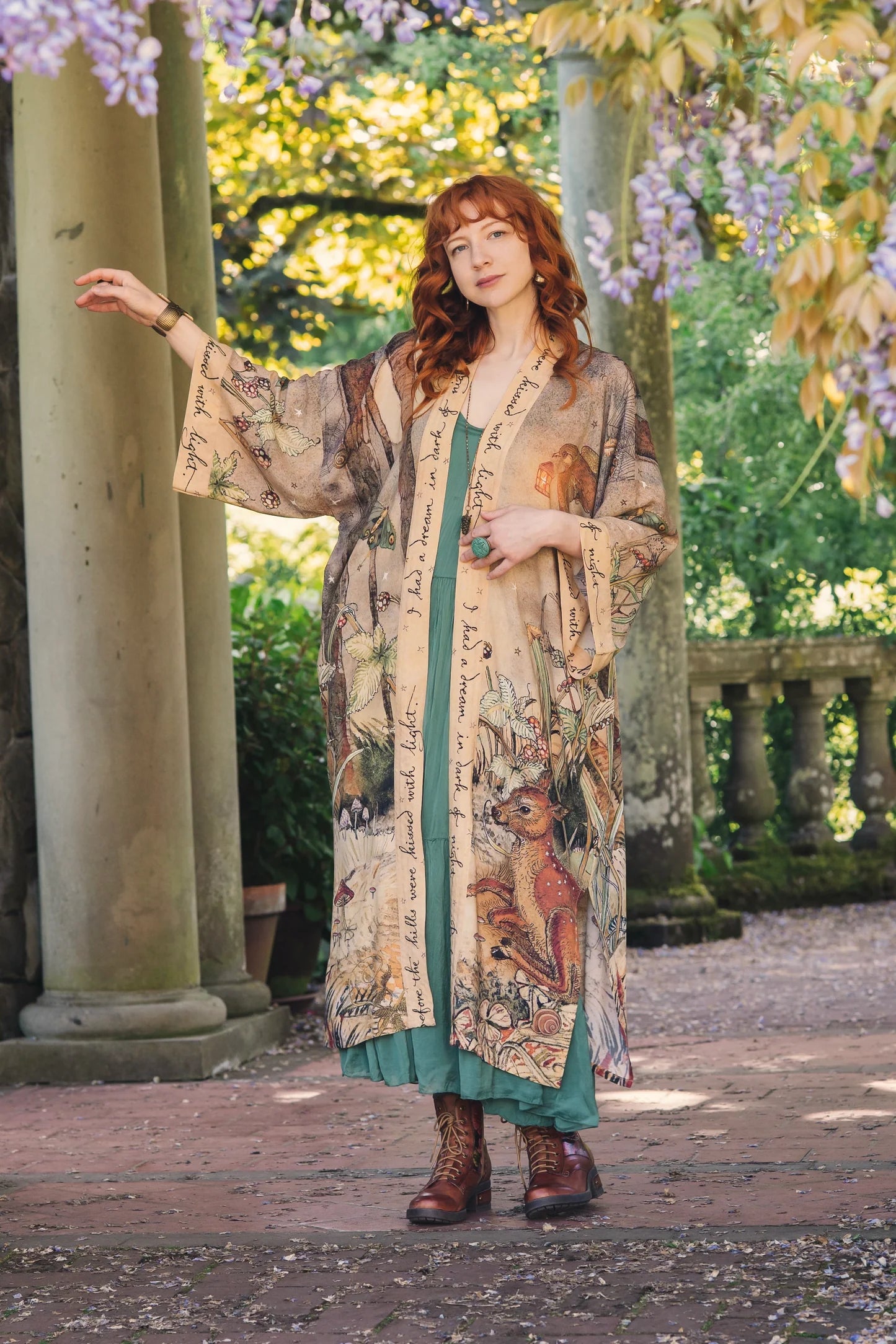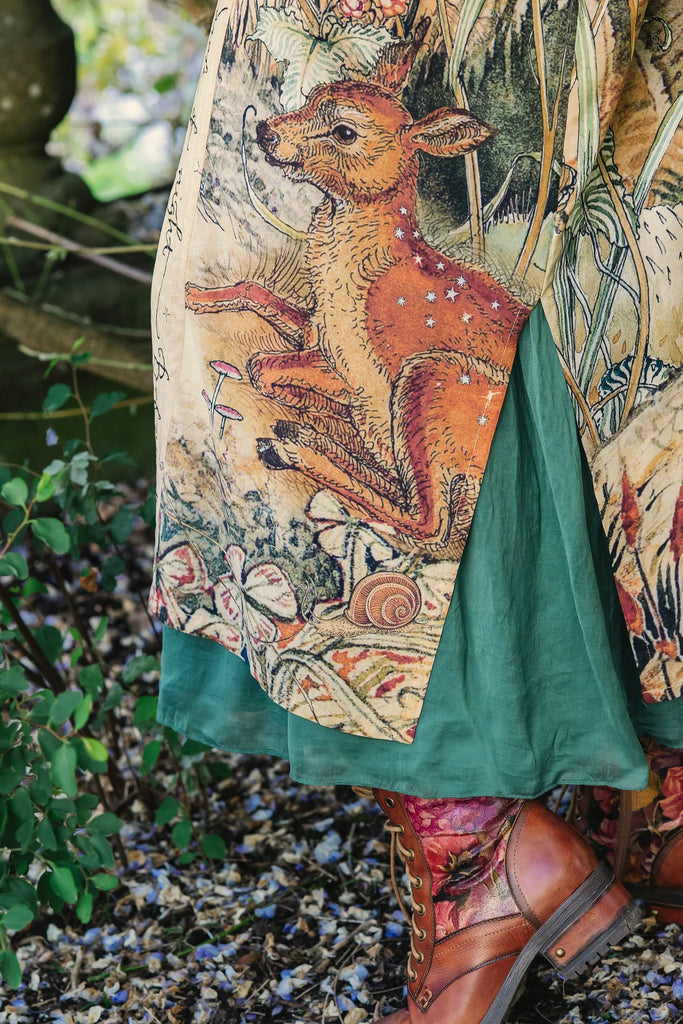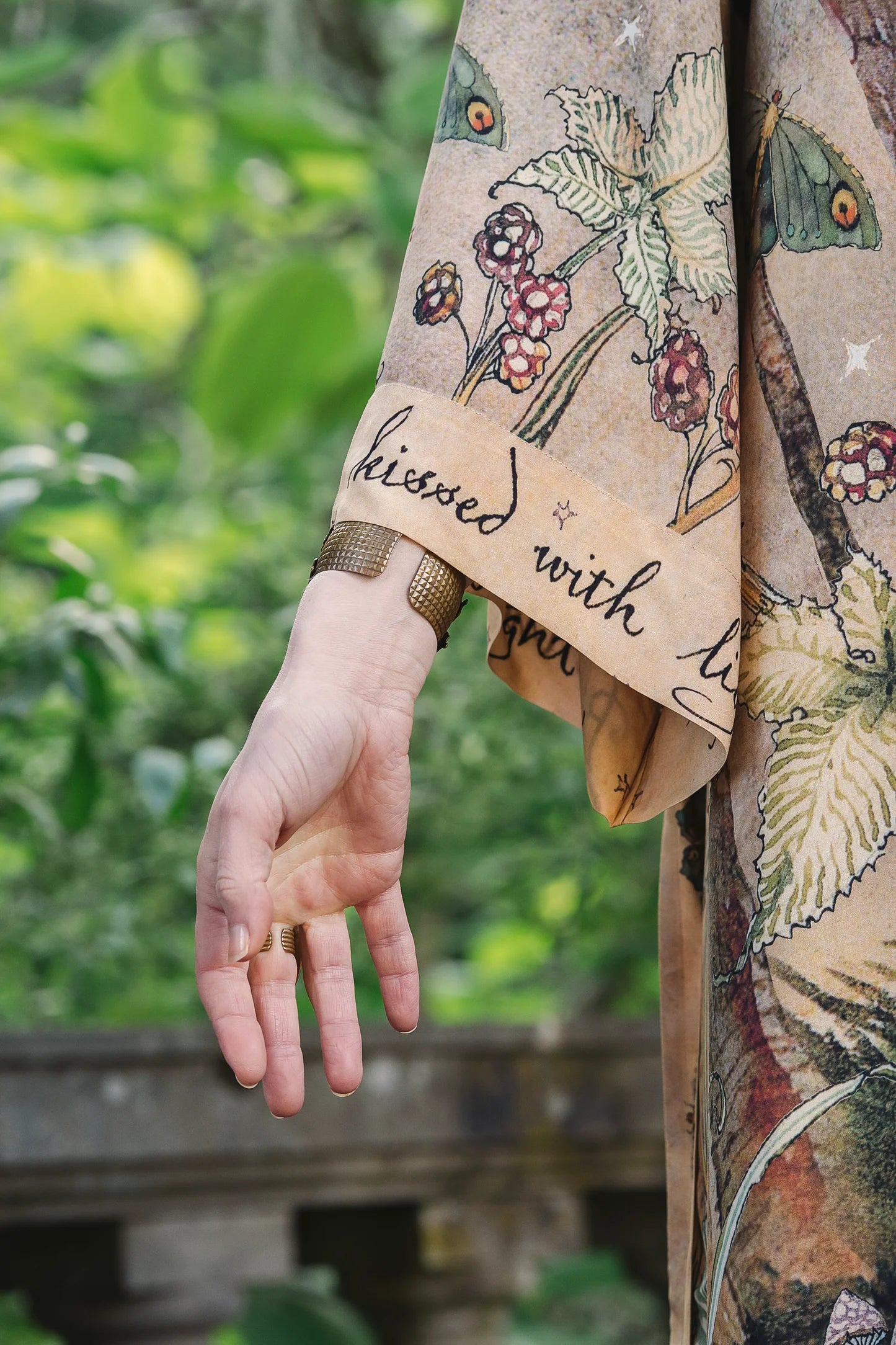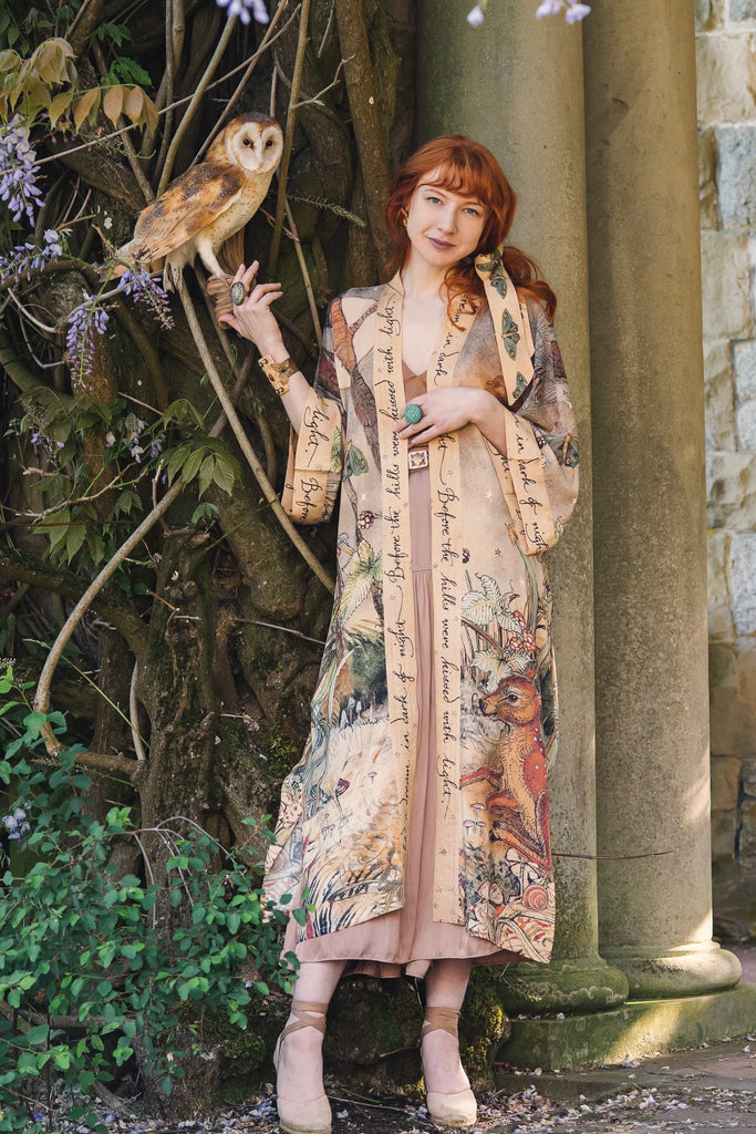 Lovelight was created using a collage of several pieces of Charles’ work, including a majestic guardian swallow carrying a lantern that cradles a glowing star, a delicate watercolour moth, and a star-dappled fawn nestled in the moonlit woods. The whole collection is edged with a piece of poetry by van Sandwyk, which wraps the wearer in words as soft as the dawn: I had a dream in dark of night, before the hills were kissed with light.