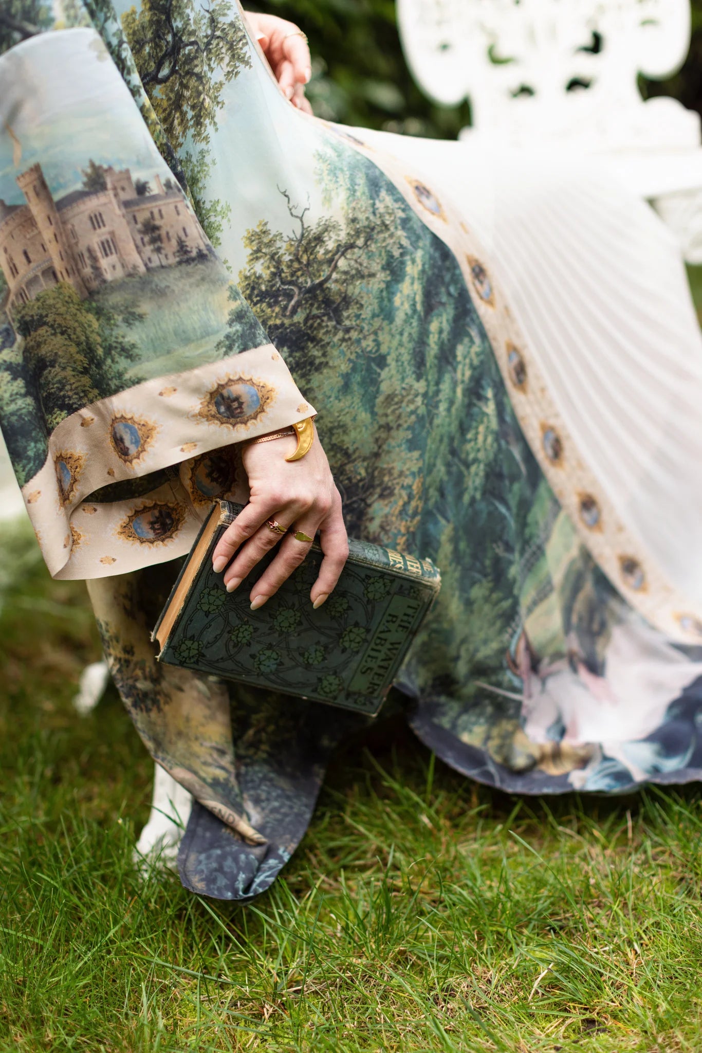 At its heart is a fresco from the early 1600s, where a barefoot woman cradles a unicorn — a creature long associated with intuition, purity of heart, and the magic that lives just beyond the veil. She rests amid two sweeping 18th-century pastoral landscapes, where wild woods spill into golden meadows, and in the distance rises Ericstan, the lost castle of Tarrytown, rendered in an 1855 watercolour. (Though it once stood in the hills of New York, little trace of it remains — except, perhaps, in dreams.) As a final, poetic touch, we added a laurel, palm, and juniper wreath — painted by Leonardo da Vinci — inscribed with the words: She wandered into legend.